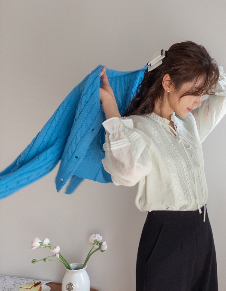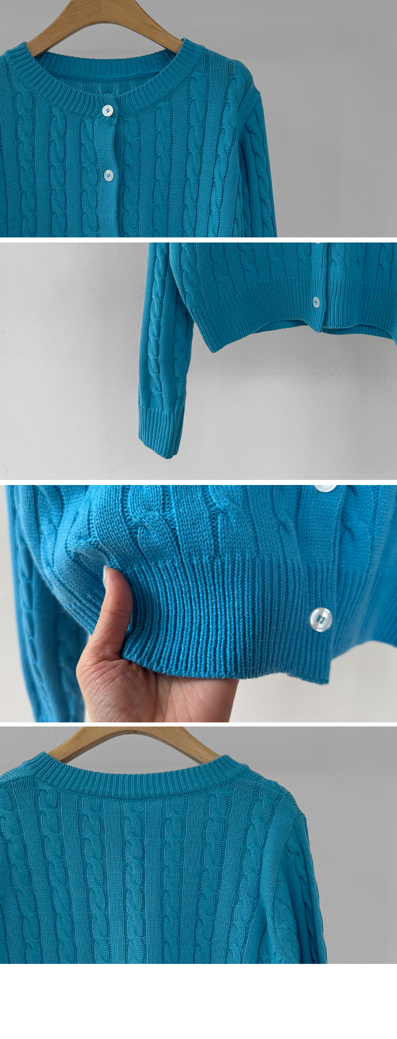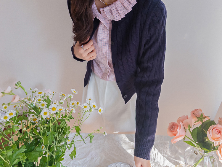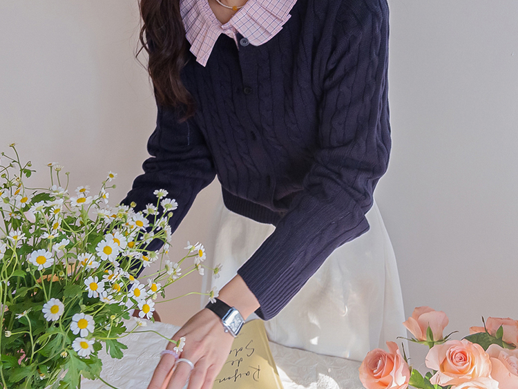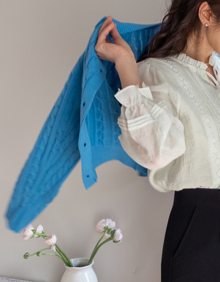 컬러감이 매력적인 꽈배기 니트 가디건 소개드려요 ^^ 전체적으로 라운드넥 디자인에 깔끔하게 떨어지는 핏으로 단정하면서도 데일리하게 입기 좋은 아이템이에요. 니트 전체에 꽈배기 짜임 디테일을 더해 심플한 디자인에 은은한 포인트를 주었고 입체감 있는 텍스처가 돋보이는 가디건입니다. 골반 위로 살짝 올라오는 세미 크롭 기장으로 부담스럽지 않으면서도 비율이 좋아 보이게 연출해줘요. 슬랙스, 데님, 스커트와 함께 다양하게 매치하기 좋으며 단독으로 입거나 이너와 레이어드해도 예쁜 아이템이에요. 핑크, 아이보리, 그린, 네이비 등 컬러별로 소장하기 좋은 데일리 니트 가디건으로 추천드릴게요 ♡