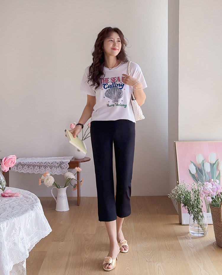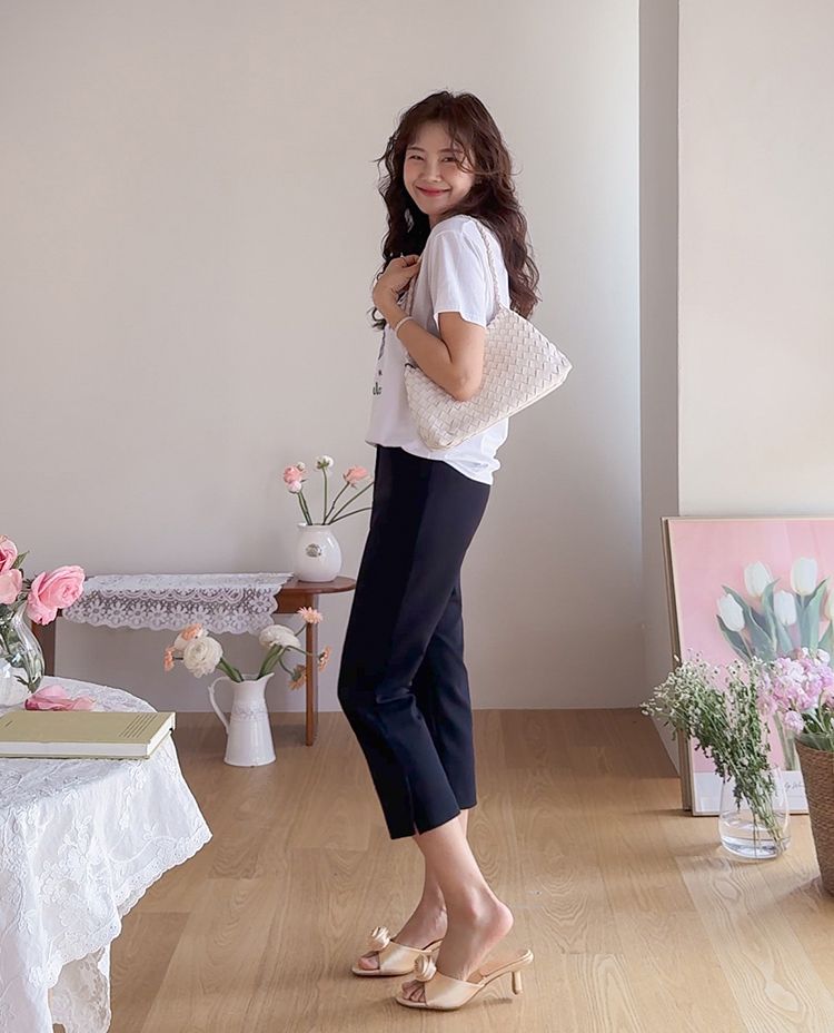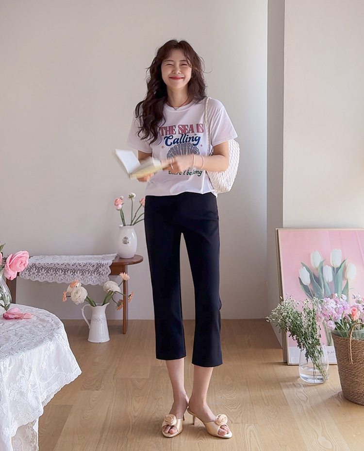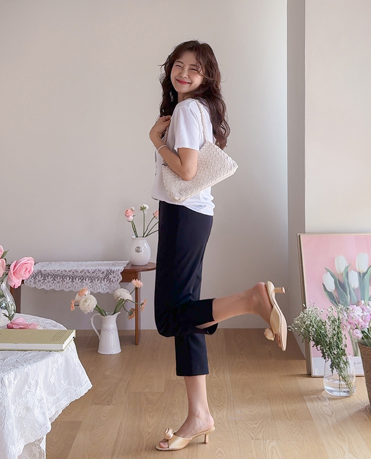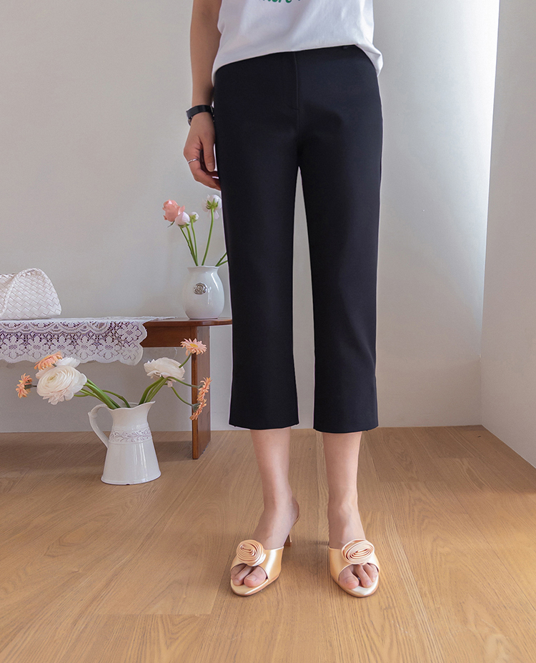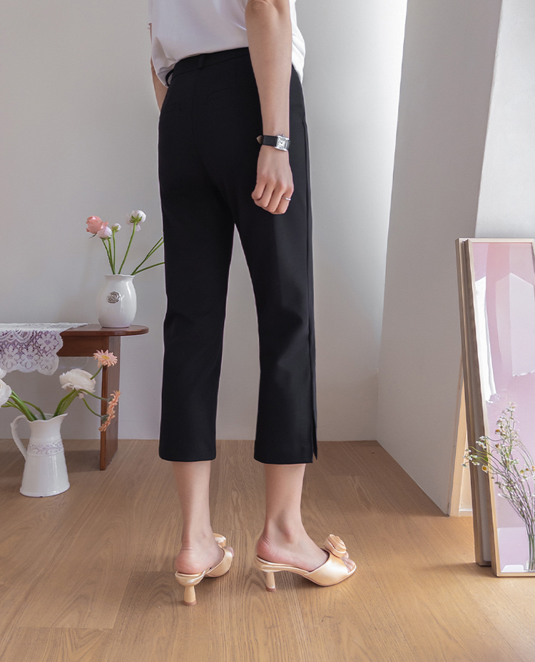 깔끔하면서도 활동성이 좋은 카프리 팬츠 소개드려요 ^^ 전체적으로 레깅스처럼 과하게 붙지 않으면서 다리 라인을 따라 슬림하게 정리되는 핏으로 부담 없이 착용하기 좋은 팬츠예요. 기장은 종아리 중간보다 살짝 아래로 떨어지는 카프리 기장으로 가볍고 산뜻한 분위기를 연출해주며 여름 시즌에도 시원하게 입기 좋고요, 밑단 옆에는 슬릿 디테일이 더해져 움직임이 편하면서도 은은한 포인트가 되어줍니다. 신축성 있는 스판 원단으로 제작되어 활동성이 뛰어나고 착용감이 편안해 데일리 팬츠로 활용도 높게 입기 좋은 아이템이에요 ♥