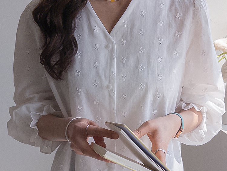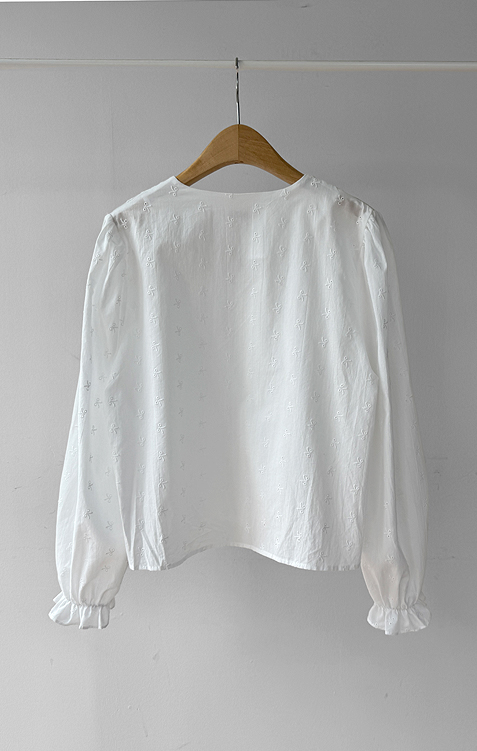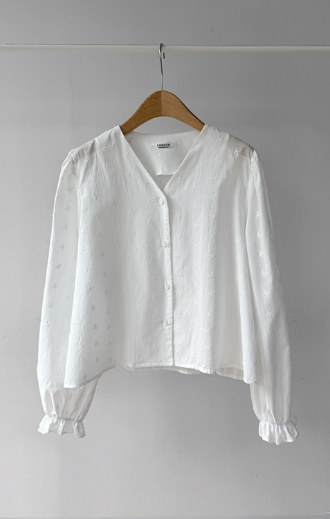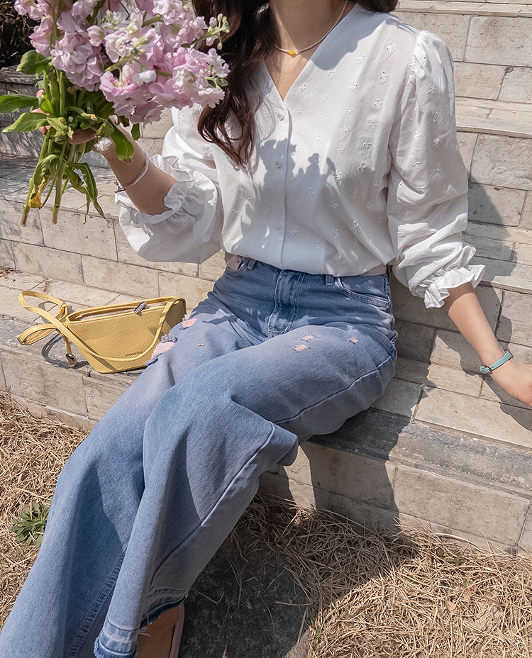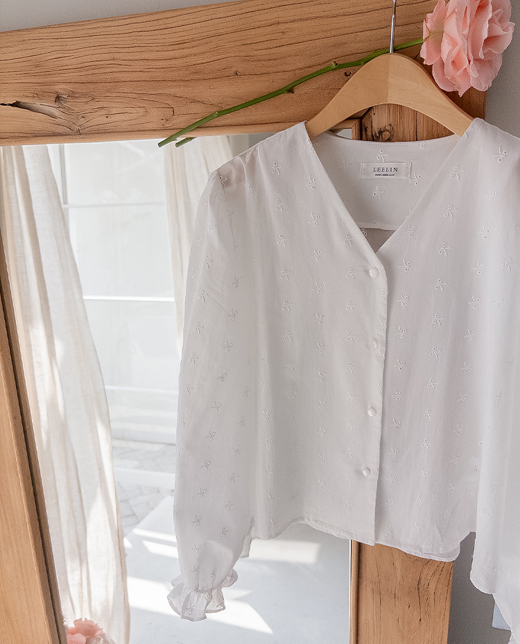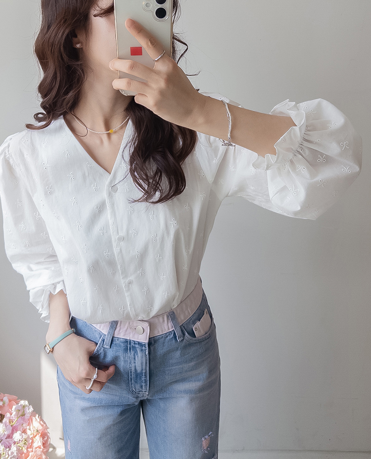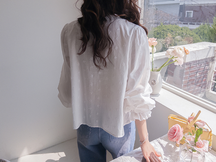 깔끔하면서도 은은한 디테일이 돋보이는! 여성스러운 무드를 가득 담은 블라우스 소개드려요 :) 전체적으로 군더더기 없이 떨어지는 핏에 잔잔하게 더해진 자수 패턴이 포인트가 되어 단독으로도 충분히 분위기 있는 아이템이에요*.* 브이넥 라인으로 목선과 쇄골이 자연스럽게 드러나 답답함 없이 여리여리한 실루엣을 연출해주고, 얼굴까지 한층 더 화사해 보이게 해준답니다ㅎㅎ 프론트 버튼 디테일로 오픈/클로징이 간편하면서 깔끔한 아웃핏을 완성해주구요~ 소매 끝에는 밴딩 + 프릴 디테일이 더해져 손목을 가볍게 잡아주면서 은근한 볼륨감을 살려주어 사랑스러운 포인트까지 챙겨줬어요 :) 적당히 여유 있는 핏으로 상체 라인을 자연스럽게 커버해주어 부담 없이 편안하게 착용 가능하구요! 톡톡하면서도 부드러운 코튼 텍스처로 피부에 자극 없이 산뜻하게 닿아 데일리로 즐기기 좋은 소재감이에요✨ 과하게 비침 없이 은은하게 비치는 정도로 여리한 무드를 더해주면서 봄, 가을 시즌 활용도 높게 입기 좋아요! 골반 위로 떨어지는 세미 크롭 기장감으로 하이웨스트 팬츠, 스커트와 매치했을 때 비율이 더욱 좋아 보이구요 :) 데님, 슬랙스, 스커트 어디에나 잘 어울려 데이트룩부터 출근룩까지 다양하게 활용 가능한 아이템이에요♡ 하나쯤 소장하시면 데일리 + 러블리 + 단정한 무드까지 모두 챙길 수 있는 블라우스로 적극 추천드릴게요 :)