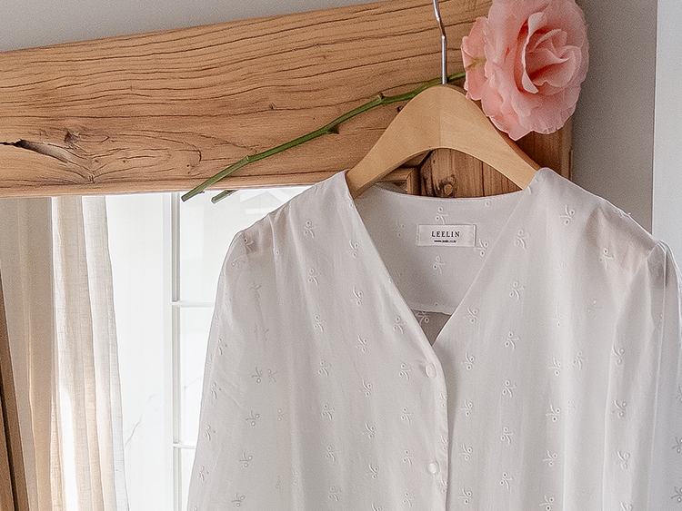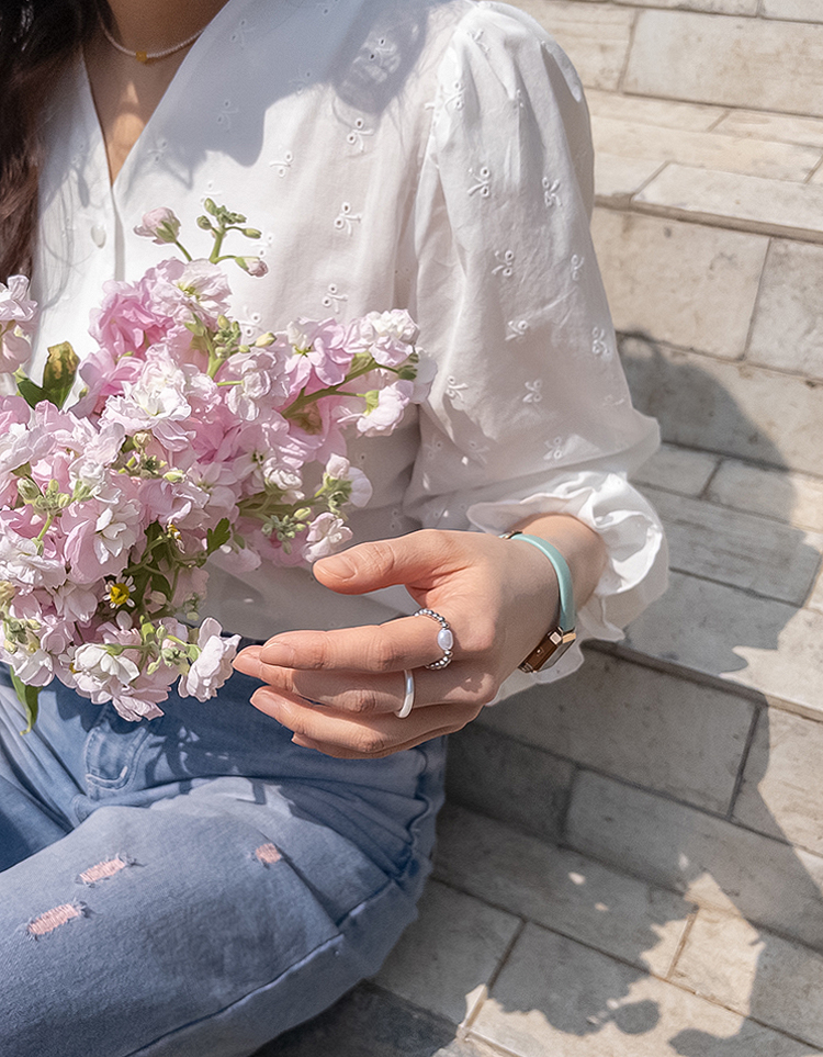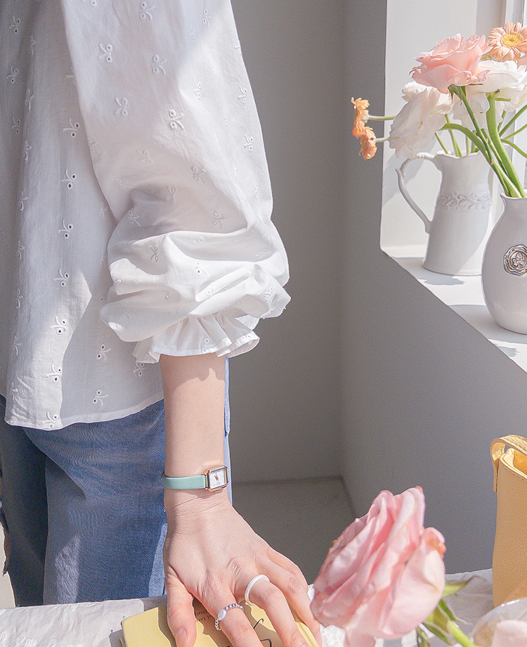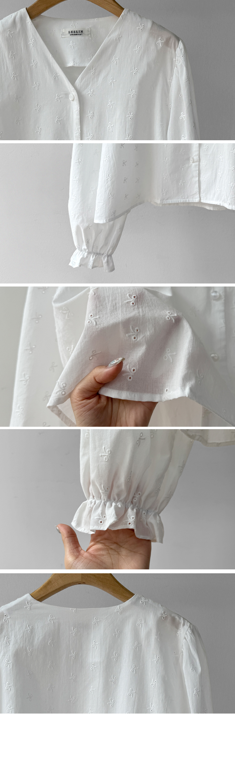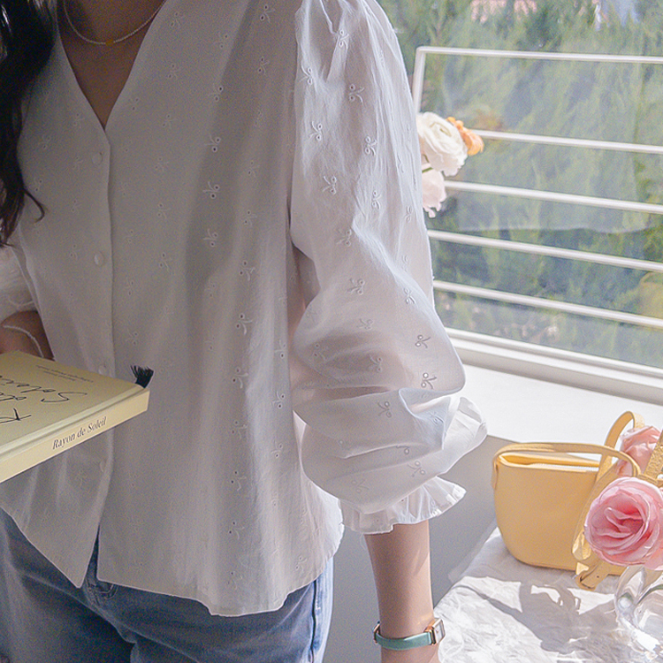 깔끔하면서도 은은한 디테일이 돋보이는! 여성스러운 무드를 가득 담은 블라우스 소개드려요 :) 전체적으로 군더더기 없이 떨어지는 핏에 잔잔하게 더해진 자수 패턴이 포인트가 되어 단독으로도 충분히 분위기 있는 아이템이에요*.* 브이넥 라인으로 목선과 쇄골이 자연스럽게 드러나 답답함 없이 여리여리한 실루엣을 연출해주고, 얼굴까지 한층 더 화사해 보이게 해준답니다ㅎㅎ 프론트 버튼 디테일로 오픈/클로징이 간편하면서 깔끔한 아웃핏을 완성해주구요~ 소매 끝에는 밴딩 + 프릴 디테일이 더해져 손목을 가볍게 잡아주면서 은근한 볼륨감을 살려주어 사랑스러운 포인트까지 챙겨줬어요 :) 적당히 여유 있는 핏으로 상체 라인을 자연스럽게 커버해주어 부담 없이 편안하게 착용 가능하구요! 톡톡하면서도 부드러운 코튼 텍스처로 피부에 자극 없이 산뜻하게 닿아 데일리로 즐기기 좋은 소재감이에요✨ 과하게 비침 없이 은은하게 비치는 정도로 여리한 무드를 더해주면서 봄, 가을 시즌 활용도 높게 입기 좋아요! 골반 위로 떨어지는 세미 크롭 기장감으로 하이웨스트 팬츠, 스커트와 매치했을 때 비율이 더욱 좋아 보이구요 :) 데님, 슬랙스, 스커트 어디에나 잘 어울려 데이트룩부터 출근룩까지 다양하게 활용 가능한 아이템이에요♡ 하나쯤 소장하시면 데일리 + 러블리 + 단정한 무드까지 모두 챙길 수 있는 블라우스로 적극 추천드릴게요 :)