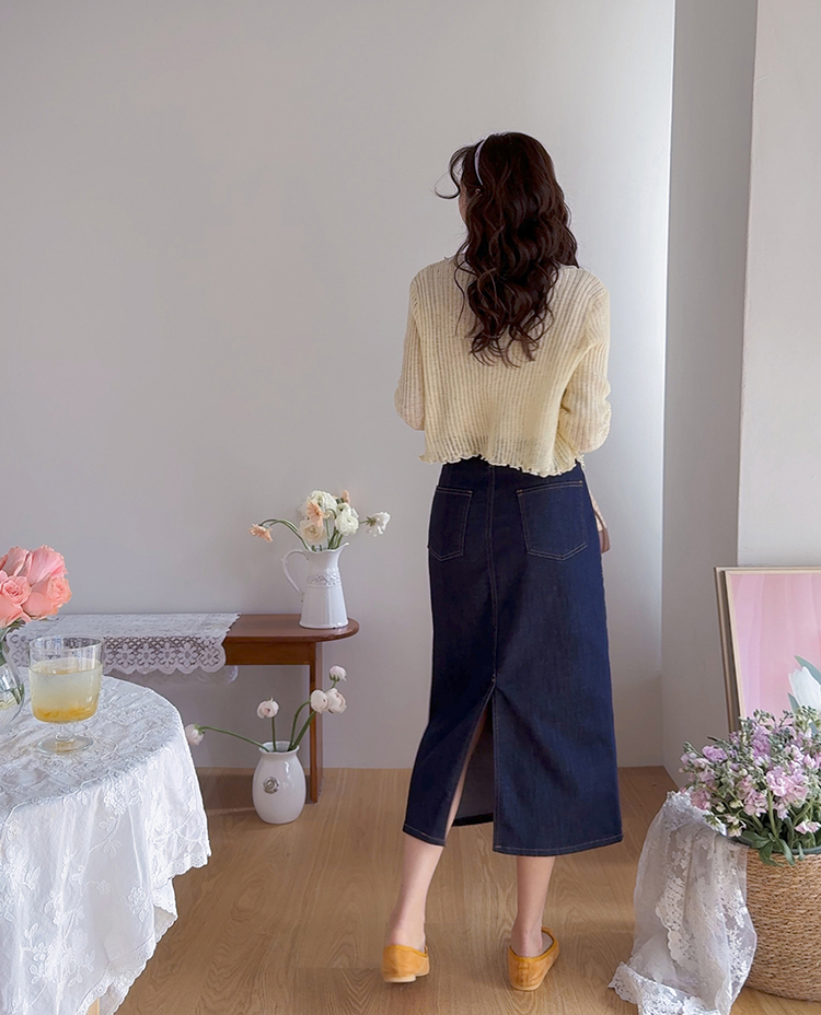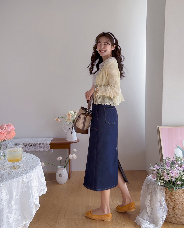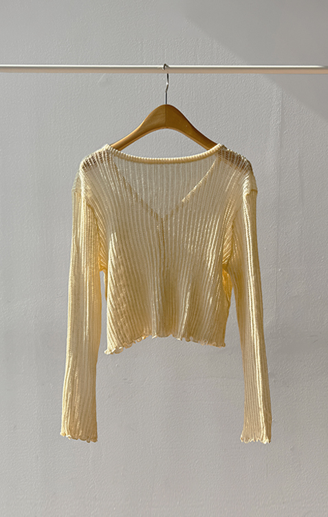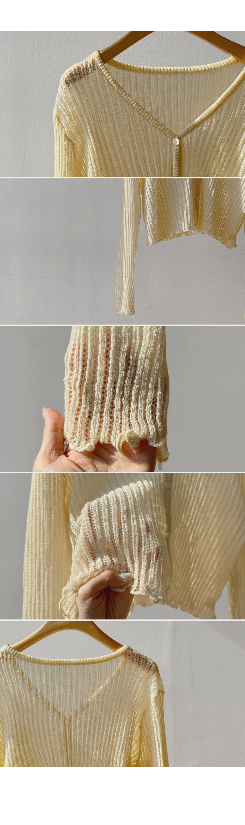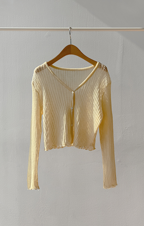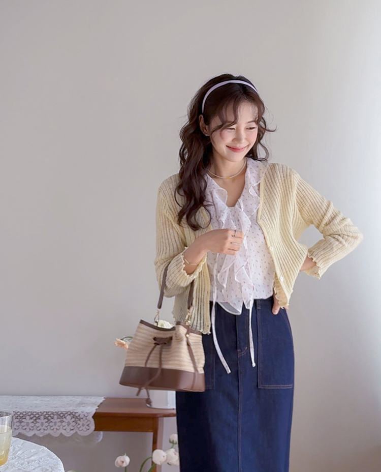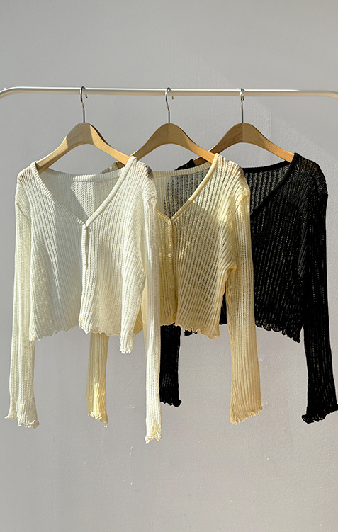 여리여리한 분위기가 돋보이는 스카시 니트 가디건 소개드려요 ^^ 전체적으로 세로 라인이 강조된 스카시 짜임 조직으로 은은하게 비치는 텍스처가 슬림하고 여성스러운 실루엣을 연출해주고요, 바디에 너무 붙지 않으면서도 적당히 라인을 따라 떨어지는 핏에 골반 위로 올라오는 크롭 기장감으로 비율까지 좋아 보이게 만들어줍니다. 밑단과 소매 끝은 **잔잔한 웨이브 마감(물결 쉐입)**으로 디테일 하나까지 여성스럽게 살려주었고요, 가볍고 부드러운 니트 소재로 간절기 시즌에 부담 없이 걸치기 좋은 아이템입니다. 스커트, 데님, 원피스 어디에나 잘 어울리는 활용도 높은 가디건이에요 ♥
