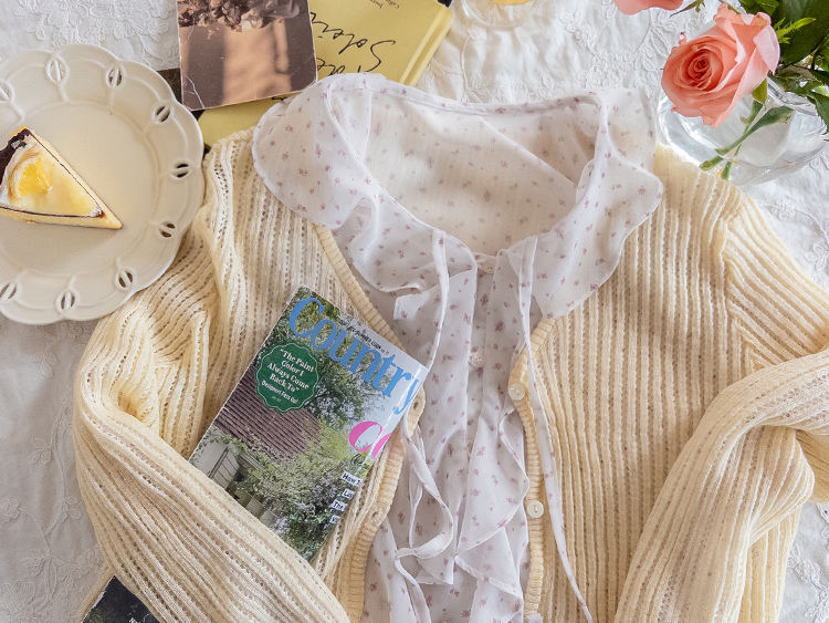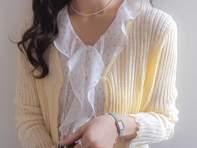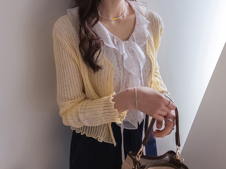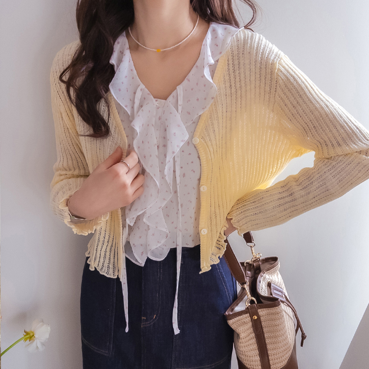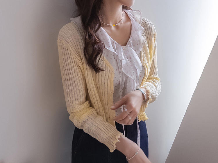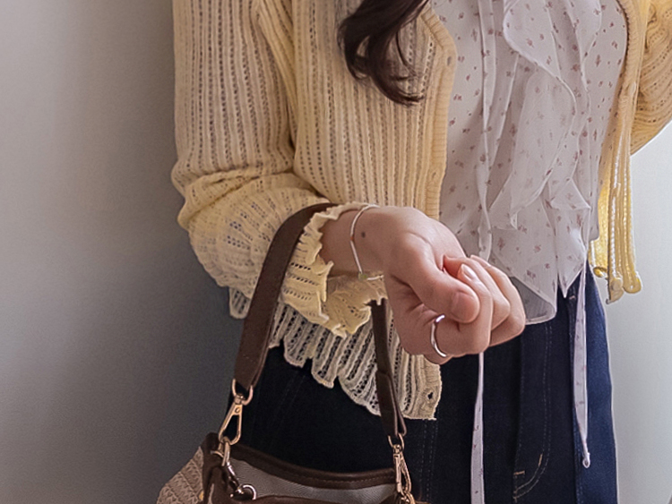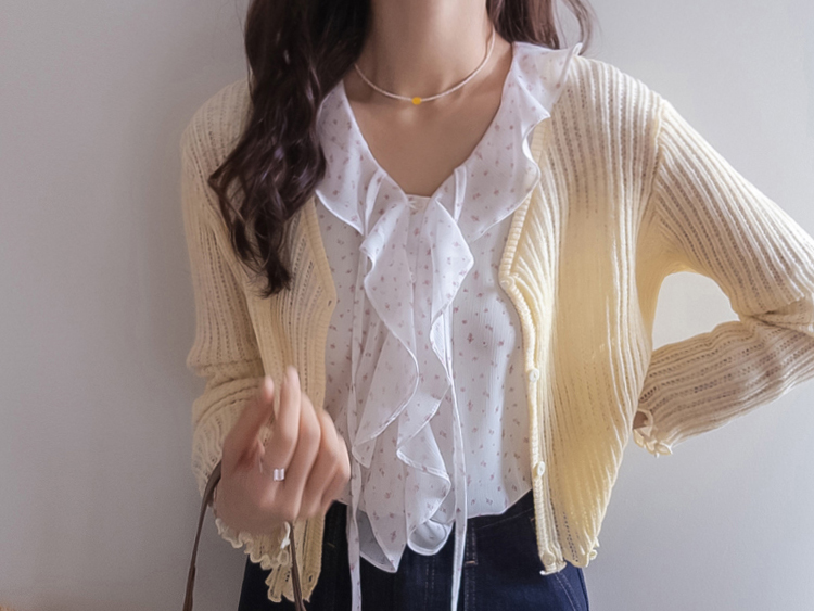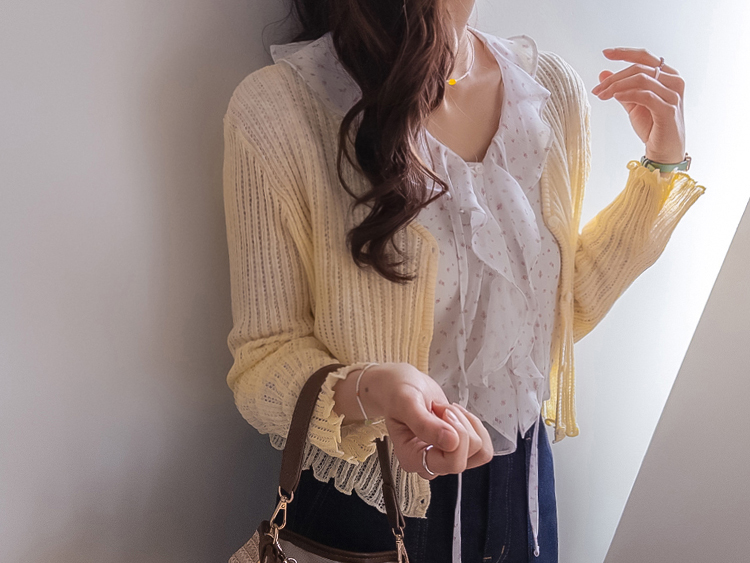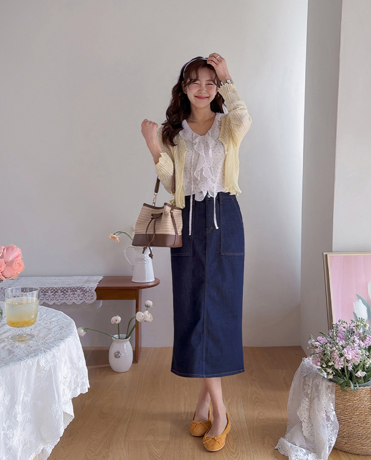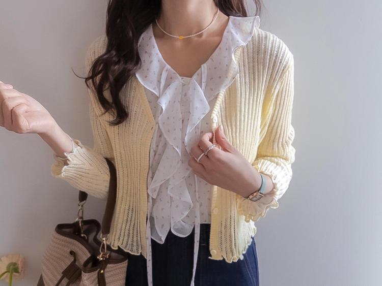 여리여리한 분위기가 돋보이는 스카시 니트 가디건 소개드려요 ^^ 전체적으로 세로 라인이 강조된 스카시 짜임 조직으로 은은하게 비치는 텍스처가 슬림하고 여성스러운 실루엣을 연출해주고요, 바디에 너무 붙지 않으면서도 적당히 라인을 따라 떨어지는 핏에 골반 위로 올라오는 크롭 기장감으로 비율까지 좋아 보이게 만들어줍니다. 밑단과 소매 끝은 **잔잔한 웨이브 마감(물결 쉐입)**으로 디테일 하나까지 여성스럽게 살려주었고요, 가볍고 부드러운 니트 소재로 간절기 시즌에 부담 없이 걸치기 좋은 아이템입니다. 스커트, 데님, 원피스 어디에나 잘 어울리는 활용도 높은 가디건이에요 ♥
