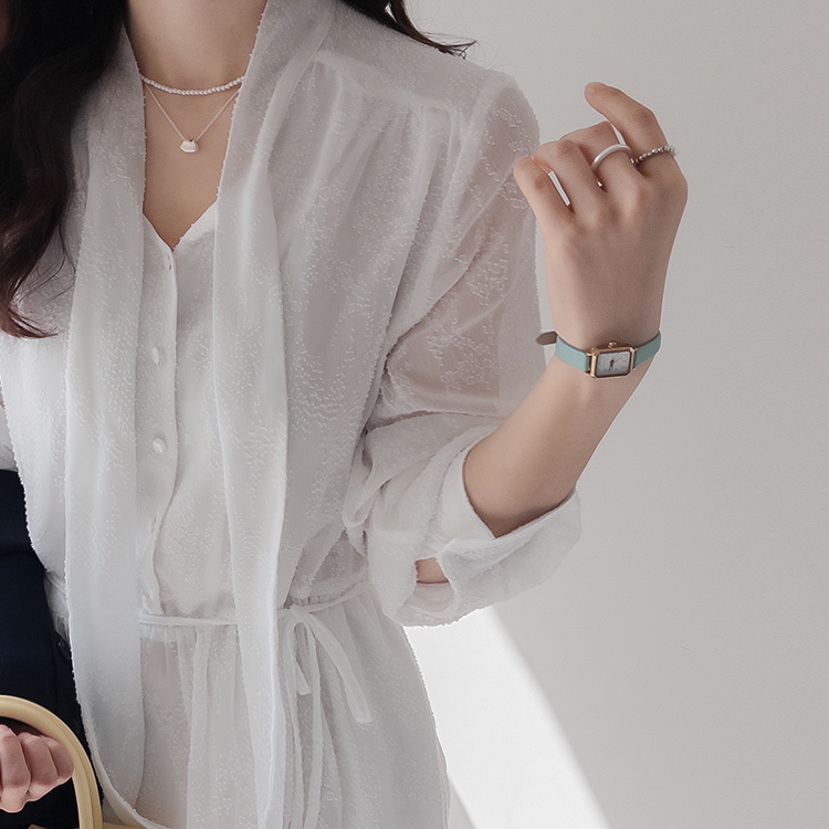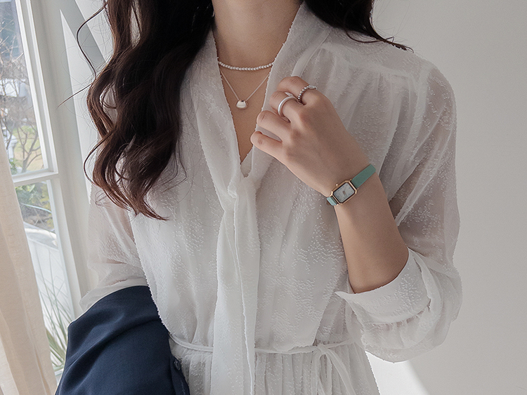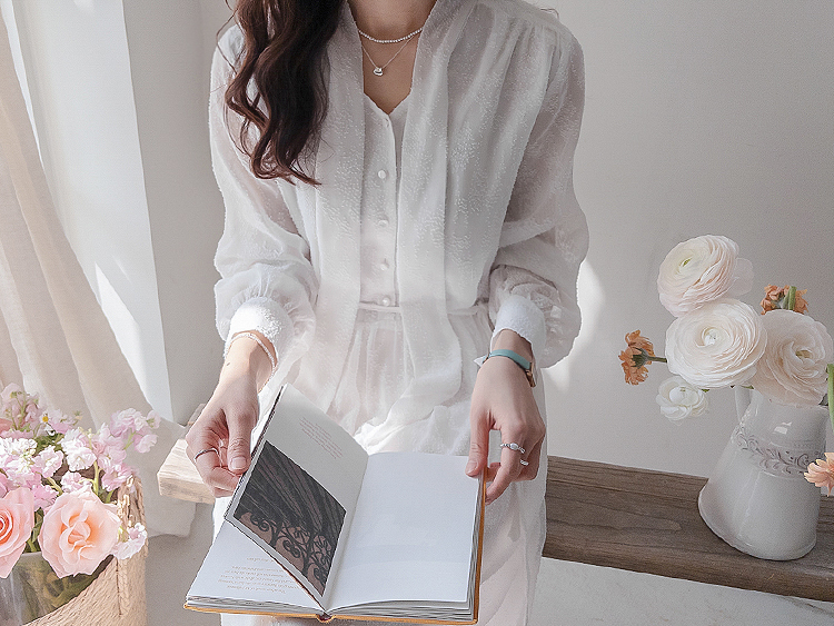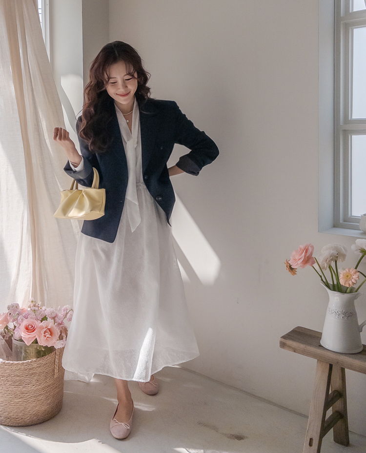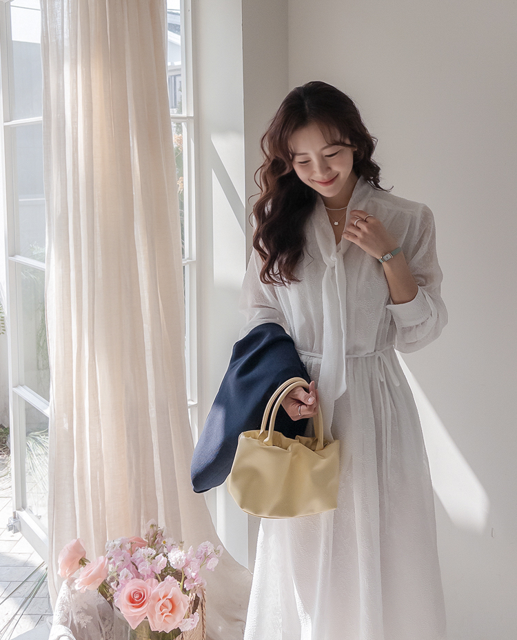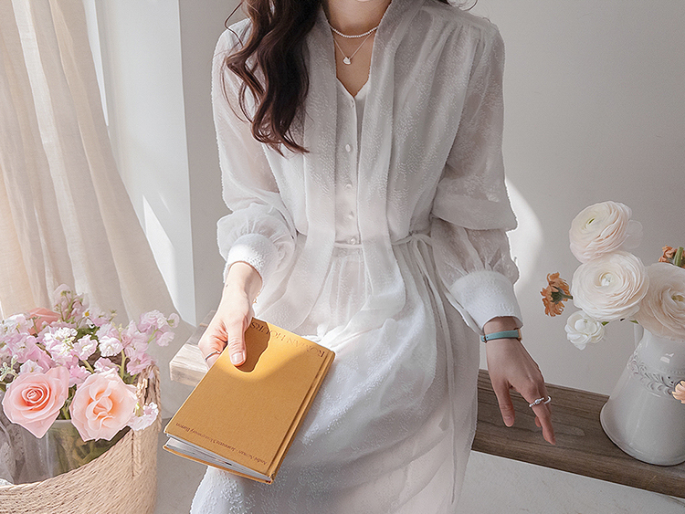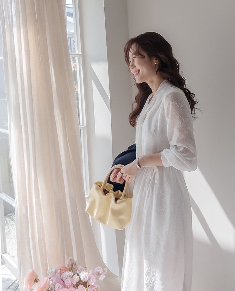 청순하면서도 여성스러운 분위기가 매력적인 레이스 롱 원피스 소개드려요 :) 전체적으로 은은한 결이 더해진 원단으로 과하지 않으면서도 고급스러운 포인트를 주는 아이템이에요*.* 넥 라인에는 2가지 연출이 가능한! 타이 디테일이 더해져 여리여리하면서도 로맨틱한 무드를 한층 더 살려주구요, 자연스럽게 떨어지는 실루엣이 단정한 분위기를 연출해준답니다ㅎㅎ 허리 부분에는 스트랩이 있어 체형에 맞게 핏 조절이 가능해 슬림하면서도 여성스러운 라인을 완성해줘요! 전체적으로 여유 있게 떨어지는 핏과 롱한 기장감으로 체형 커버까지 톡톡히 해주면서 부담 없이 즐기기 좋은 디자인이에요^.^ 가볍고 부드러운 소재감으로 착용 시 편안하면서도 기분 좋은 착용감을 느끼실 수 있구요, 밝은 컬러 특성상 비침이 있어 이너 필수! 덕분에 더욱 여리한 분위기를 더해줘요~✨ 단독으로 착용해도 충분히 포인트가 되며, 가디건이나 자켓과 함께 매치해주시면 계절에 따라 다양한 스타일링이 가능해요! 데일리룩은 물론, 데이트룩 / 하객룩 / 특별한 날까지 다양하게 활용하기 좋아 소장 가치 높은 아이템으로 추천드릴게요♡