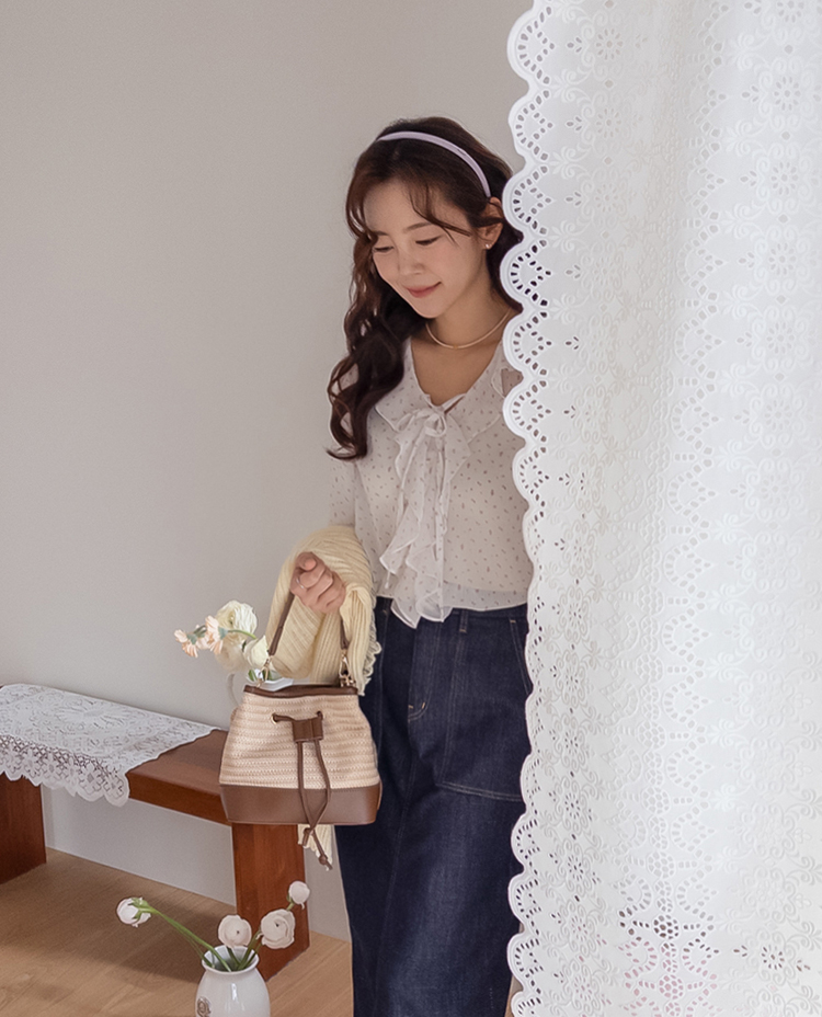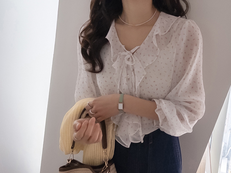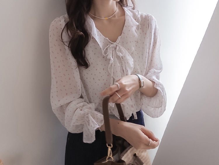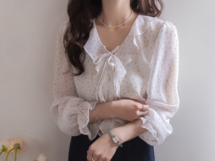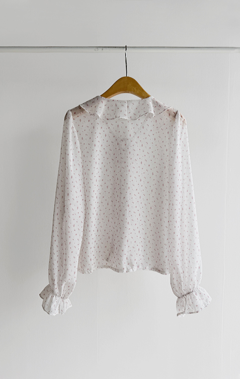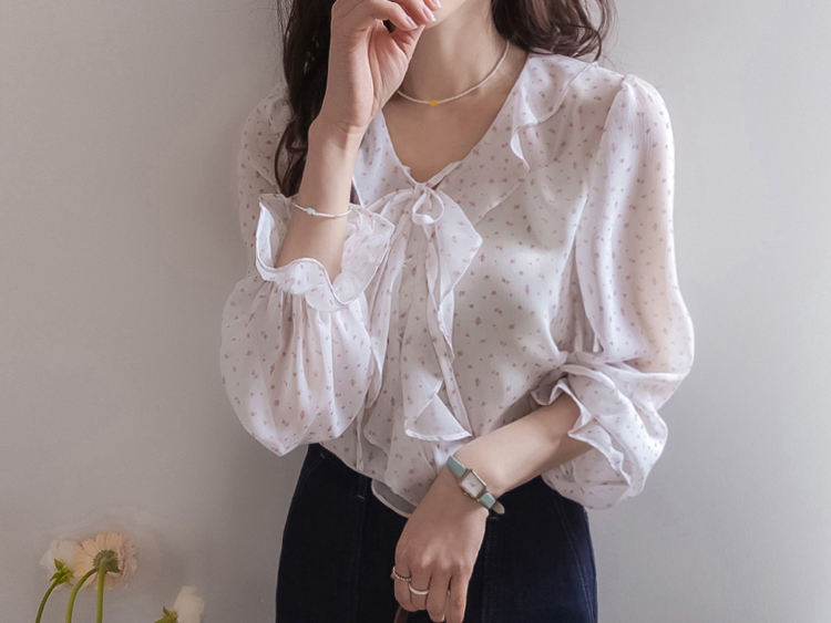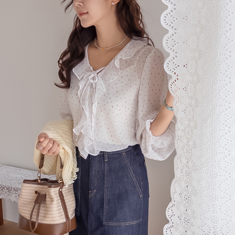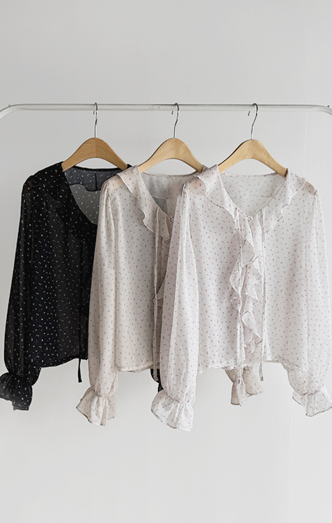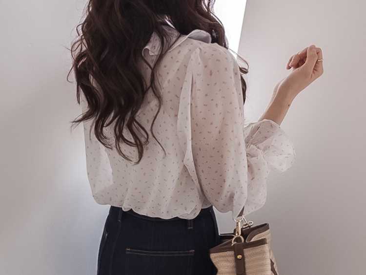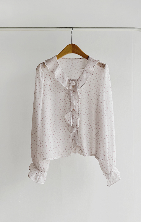 사랑스러운 분위기가 돋보이는 쉬폰 블라우스 소개드려요 ^^ 전체적으로 은은하게 퍼진 잔잔한 패턴이 더해져 부드럽고 로맨틱한 무드를 연출해주고요, 넥라인을 따라 이어지는 프릴 디테일과 스트랩 리본이 포인트가 되어 얼굴선을 더욱 화사하게 살려줍니다. 소재는 가볍고 은은하게 비치는 쉬폰 원단으로 제작되어 여리여리한 분위기를 강조해주며 움직일 때마다 자연스럽게 흐르는 실루엣이 정말 예쁘고요, 소매 끝에도 프릴 디테일이 더해져 손끝까지 여성스럽게 완성해줍니다. 데님, 스커트와 함께 매치하면 데이트룩, 모임룩으로도 손색없는 포인트 블라우스로 추천드릴게요 ♥