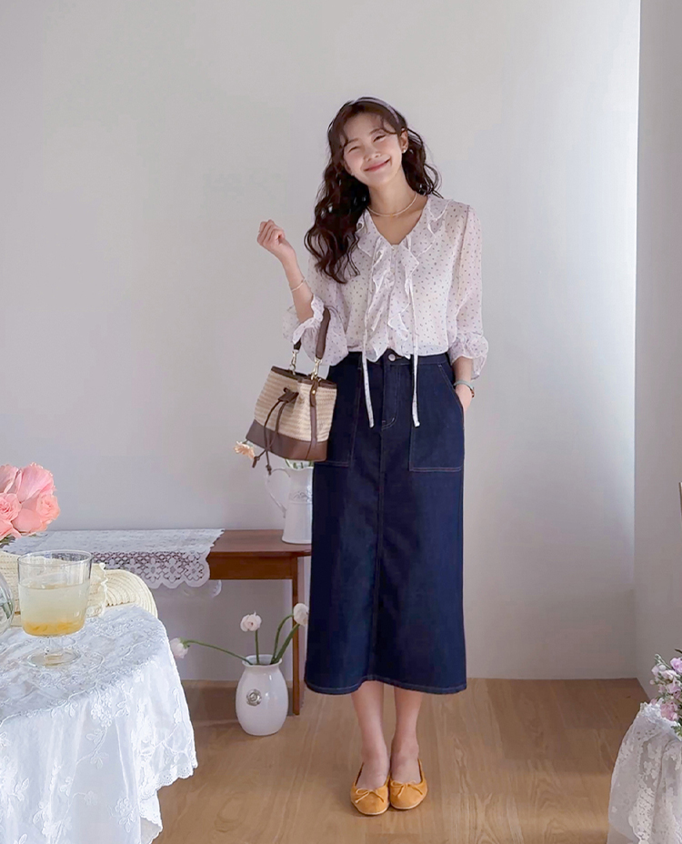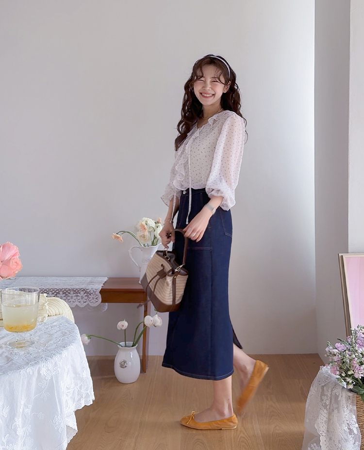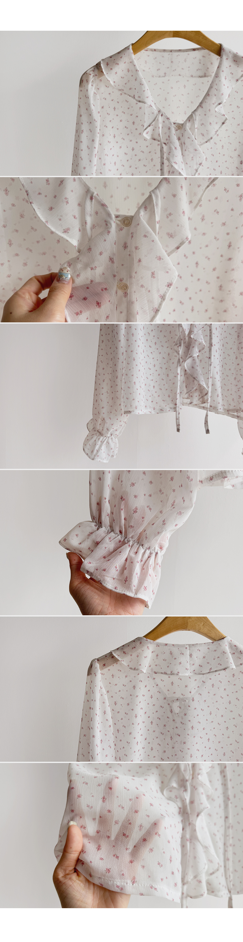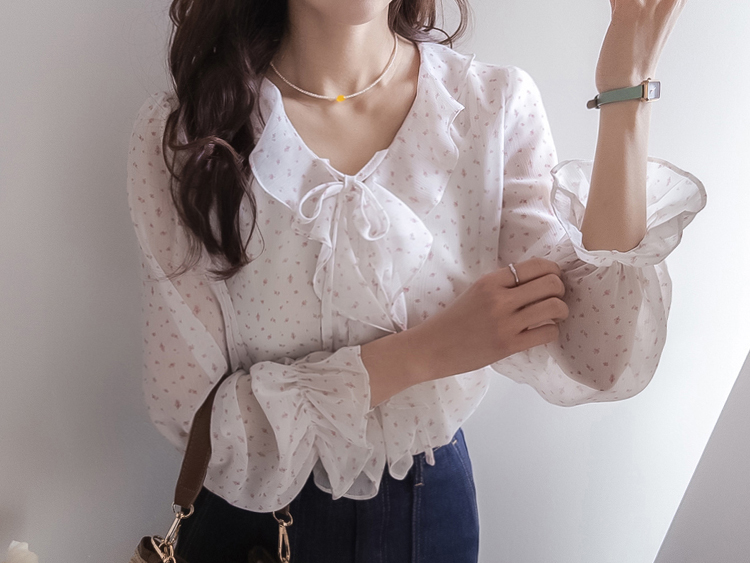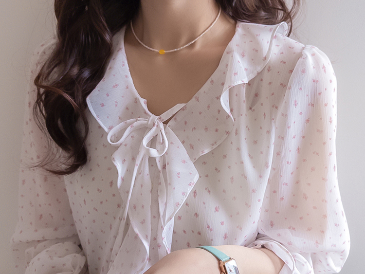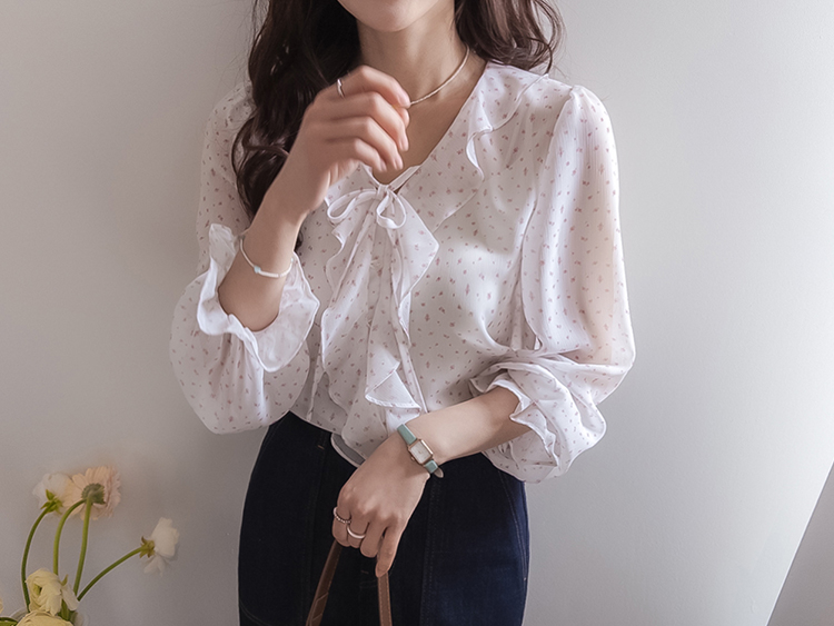 사랑스러운 분위기가 돋보이는 쉬폰 블라우스 소개드려요 ^^ 전체적으로 은은하게 퍼진 잔잔한 패턴이 더해져 부드럽고 로맨틱한 무드를 연출해주고요, 넥라인을 따라 이어지는 프릴 디테일과 스트랩 리본이 포인트가 되어 얼굴선을 더욱 화사하게 살려줍니다. 소재는 가볍고 은은하게 비치는 쉬폰 원단으로 제작되어 여리여리한 분위기를 강조해주며 움직일 때마다 자연스럽게 흐르는 실루엣이 정말 예쁘고요, 소매 끝에도 프릴 디테일이 더해져 손끝까지 여성스럽게 완성해줍니다. 데님, 스커트와 함께 매치하면 데이트룩, 모임룩으로도 손색없는 포인트 블라우스로 추천드릴게요 ♥