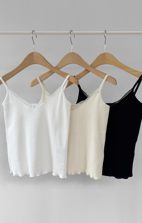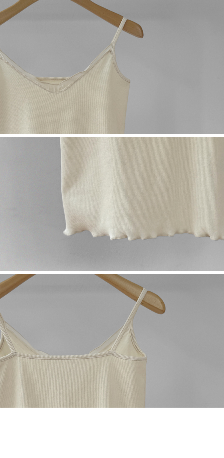 여리여리한 분위기를 살려주는 끈 나시탑 소개드려요 ^^ 전체적으로 슬림하게 떨어지는 핏에 신축성 있는 골지 원단으로 제작되어 몸에 부드럽게 감기듯 착용되는 아이템이에요. 넥라인은 은은한 V넥 디자인으로 답답하지 않으면서도 목선을 더욱 길어 보이게 연출해주고요, 앞라인을 따라 쉬폰 원단 디테일이 더해져 살짝 비치는 느낌이 부드럽고 여성스러운 분위기를 한층 더 살려줍니다. 가디건이나 니트 안 이너로 매치했을 때 넥라인 디테일이 자연스럽게 드러나 레이어드 아이템으로도 활용도가 높은 나시탑이에요 ♥