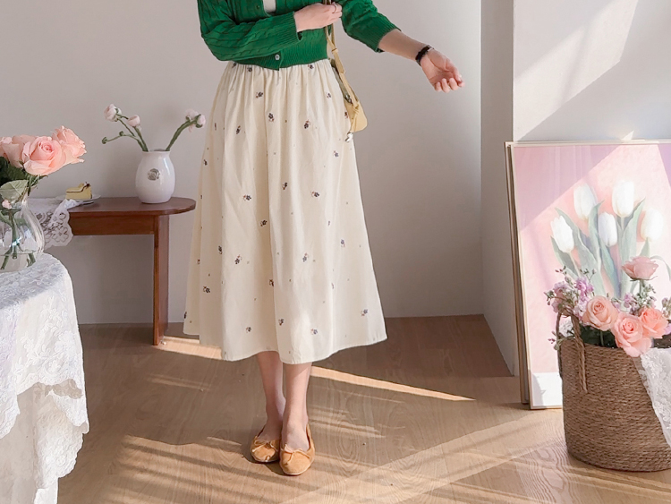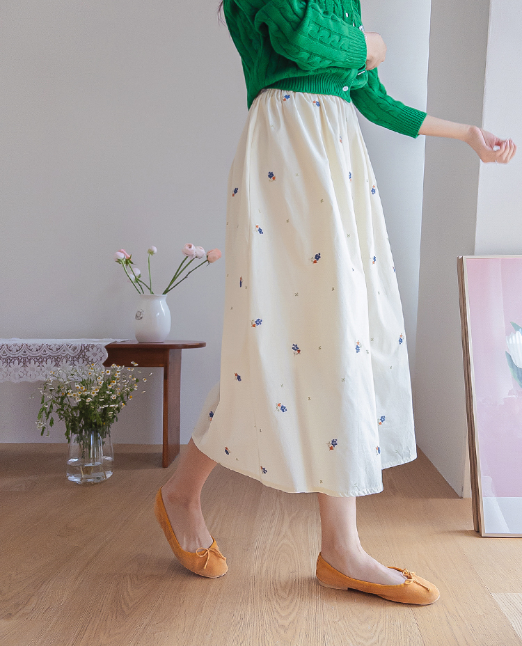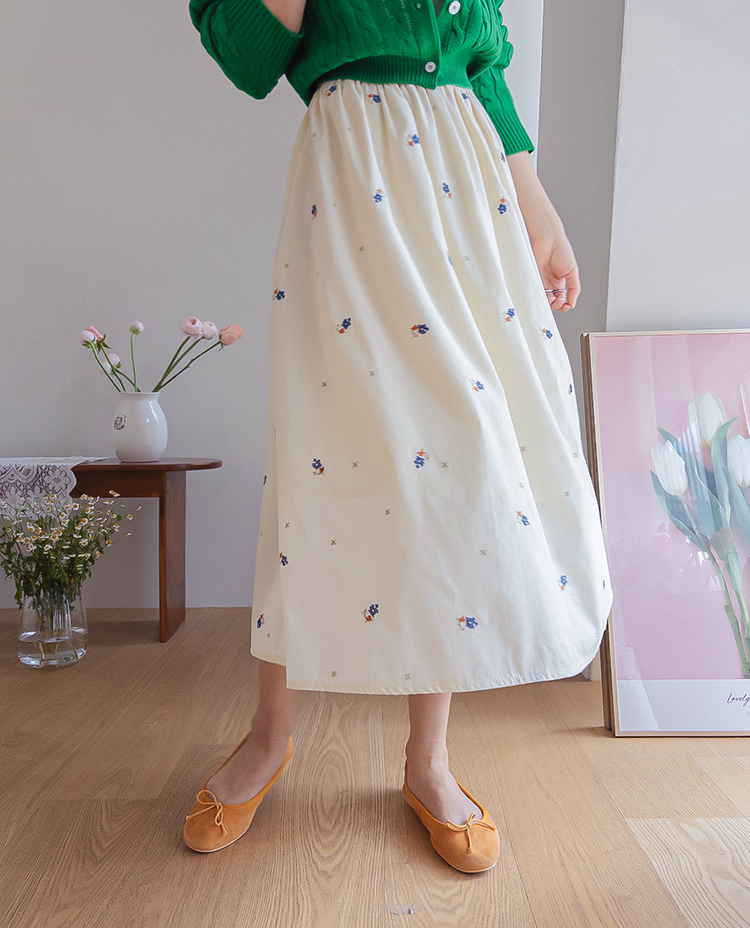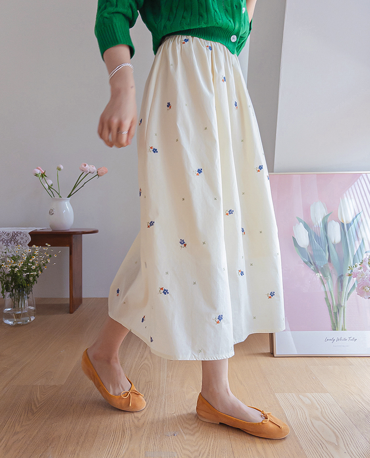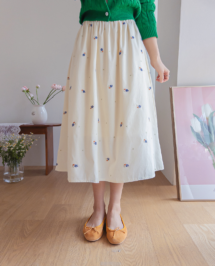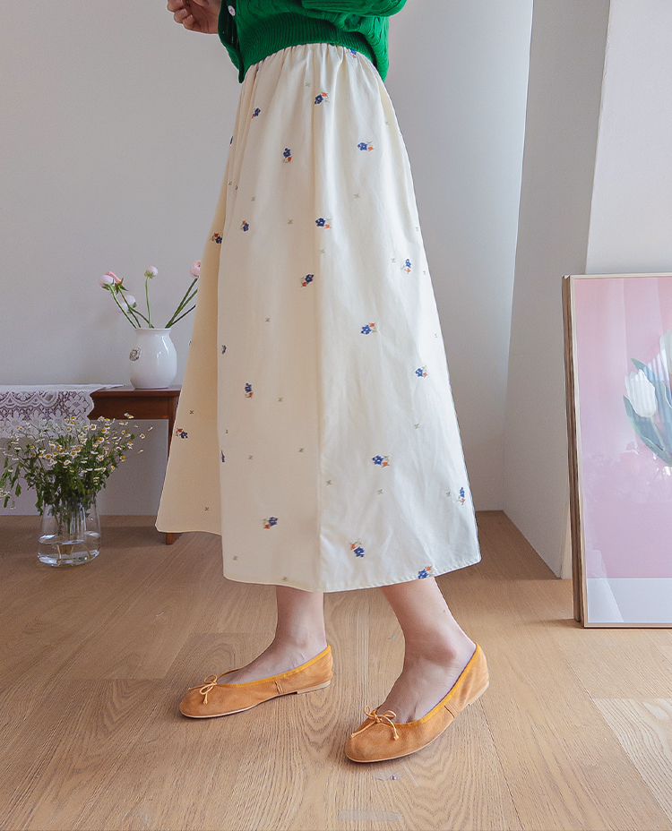 사랑스러운 분위기가 돋보이는 플라워 자수 스커트 소개드려요 ^^ 전체적으로 부드럽게 퍼지는 A라인 실루엣으로 여성스럽고 여리한 분위기를 연출해주는 스커트예요. 허리는 밴딩 디자인으로 제작되어 편안하게 착용 가능하며 자연스럽게 잡히는 셔링이 풍성한 훌을 만들어줍니다. 스커트 전체에는 잔잔한 플라워 자수 디테일이 더해져 과하지 않으면서도 봄 느낌을 한껏 살려주는 포인트가 되어주고요, 가볍고 부드러운 소재감으로 움직일 때마다 자연스럽게 퍼지며 로맨틱한 무드를 완성해줍니다. 니트, 가디건, 티셔츠와 함께 데일리부터 여성스러운 코디까지 다양하게 활용하기 좋은 스커트로 추천드릴게요 ♥