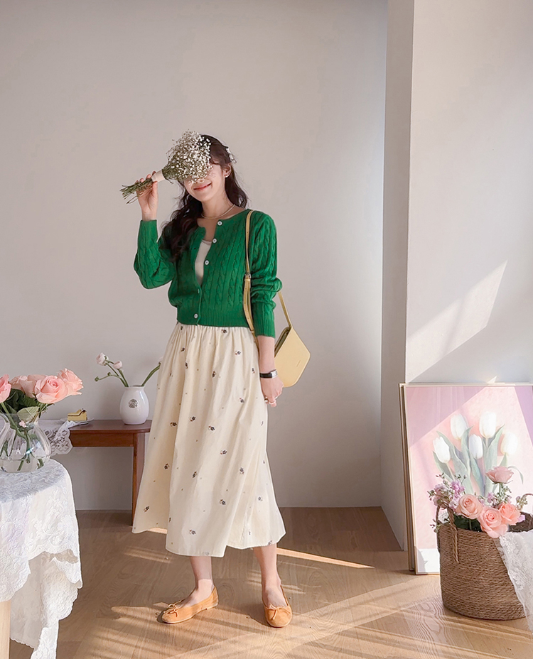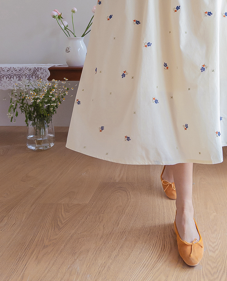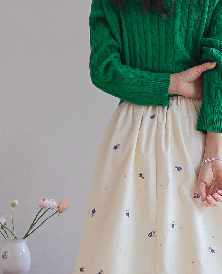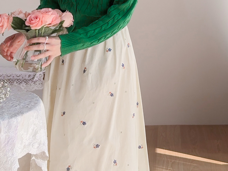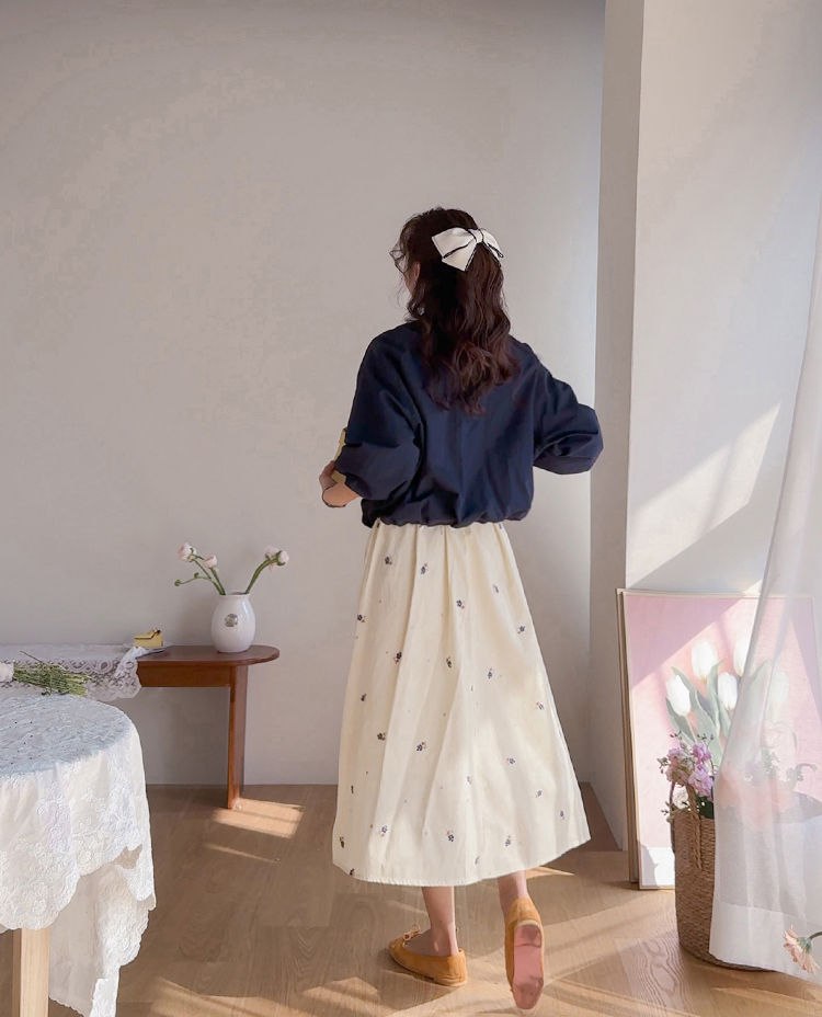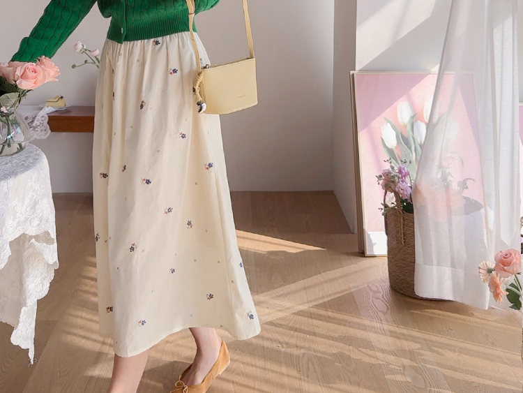 사랑스러운 분위기가 돋보이는 플라워 자수 스커트 소개드려요 ^^ 전체적으로 부드럽게 퍼지는 A라인 실루엣으로 여성스럽고 여리한 분위기를 연출해주는 스커트예요. 허리는 밴딩 디자인으로 제작되어 편안하게 착용 가능하며 자연스럽게 잡히는 셔링이 풍성한 훌을 만들어줍니다. 스커트 전체에는 잔잔한 플라워 자수 디테일이 더해져 과하지 않으면서도 봄 느낌을 한껏 살려주는 포인트가 되어주고요, 가볍고 부드러운 소재감으로 움직일 때마다 자연스럽게 퍼지며 로맨틱한 무드를 완성해줍니다. 니트, 가디건, 티셔츠와 함께 데일리부터 여성스러운 코디까지 다양하게 활용하기 좋은 스커트로 추천드릴게요 ♥