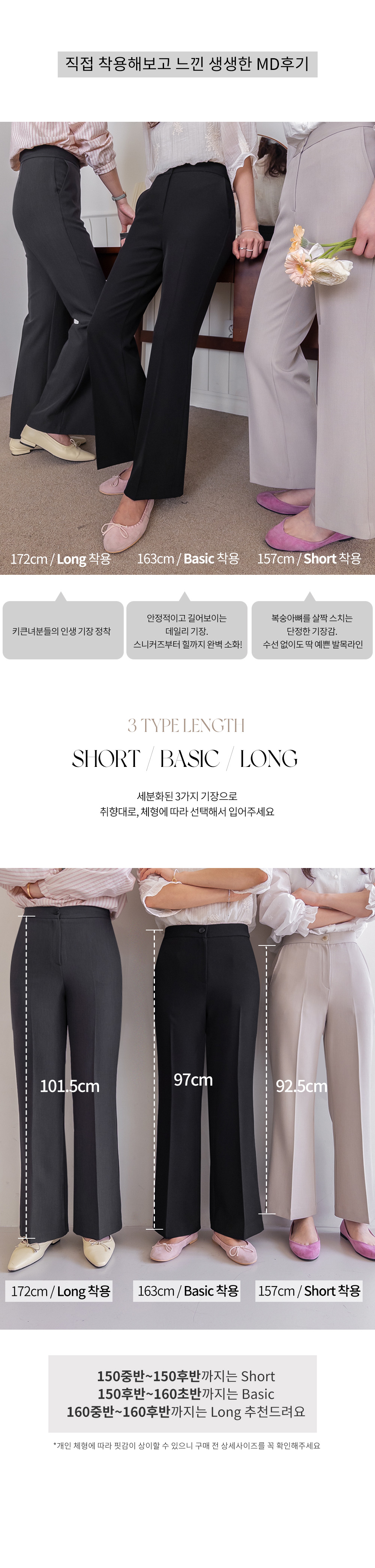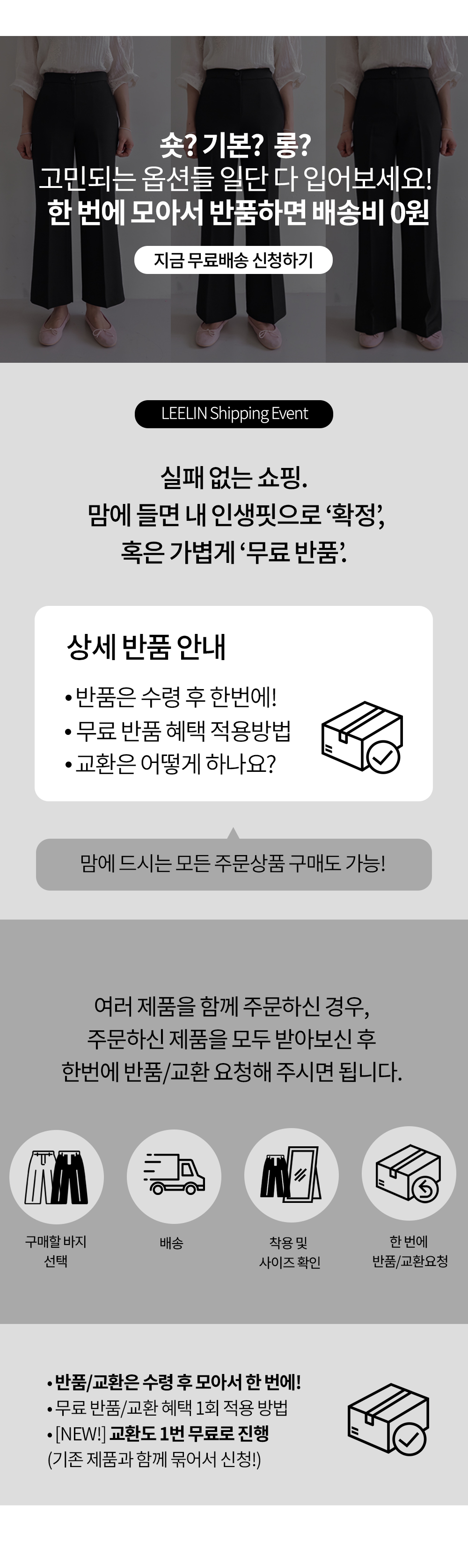 작은 키, 큰 키 어중간한 기장의 바지 핏으로 고민 많으셨던 분들 여기 주목!! 리린이 그 고민을 덜어주기 위해 숏, 기본, 롱 3가지 세분화된 기장을 준비했어요~ 말 그대로 수선비 0원인 제로컷 부츠핏으로 하체 군살을 쏘옥 가려 예쁜 라인 만들어주고~ 수선 없이 내 키에 딱 맞는 기장감을 선택할 수 있답니다ㅎㅎ 편안한 허리 전체 밴딩은 물론, 스판이 있어 앉았다 일어나도~ 밥을 많이 먹어도 너무 편해요*.* 안정적이고 길어보이는 데일리 기장으로 휘뚤~마뚤 즐기기 좋은 슬랙스!! 놓치면 정말 후회하실 거예요~ 강추 드려요~♡