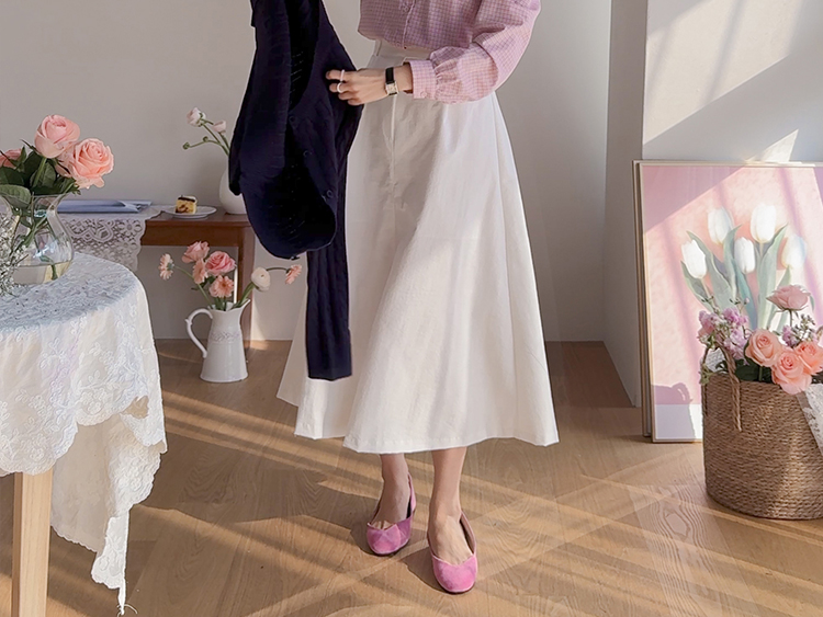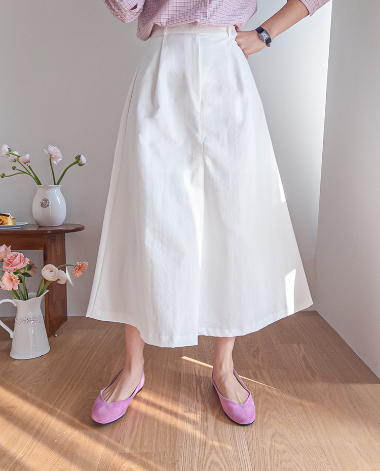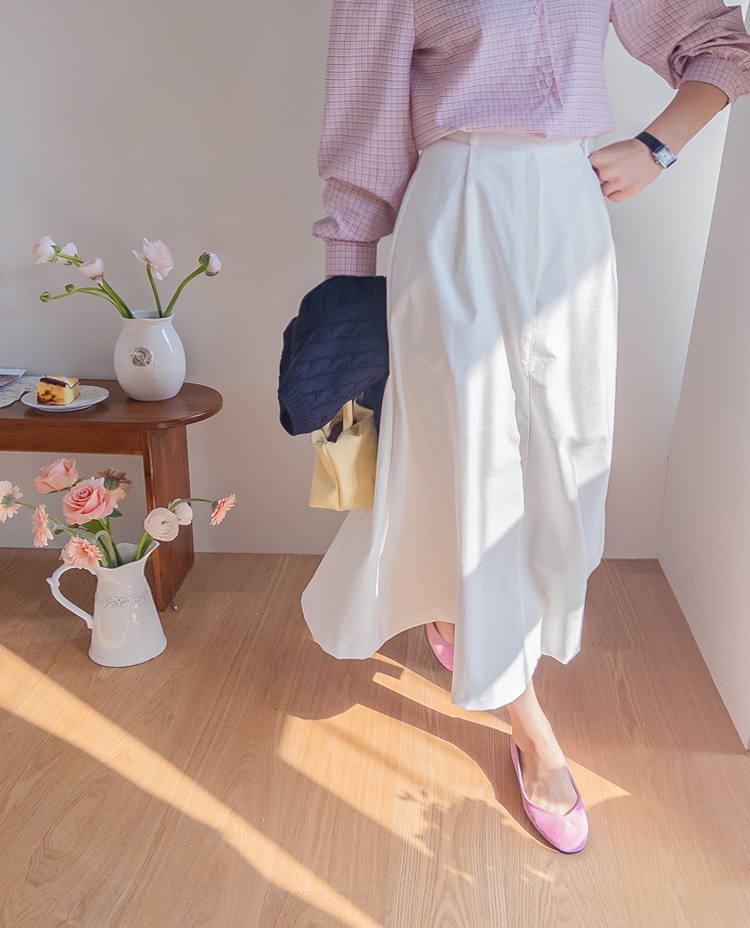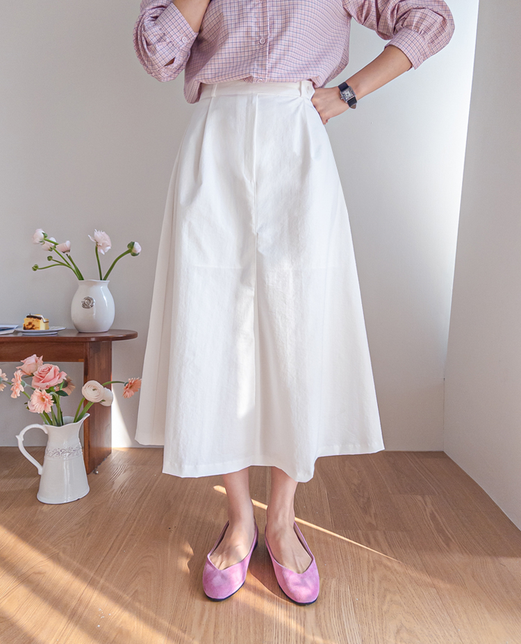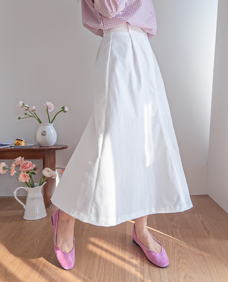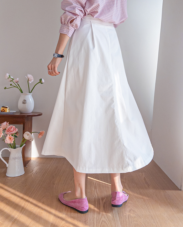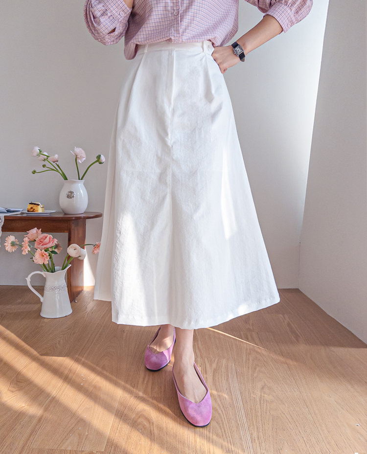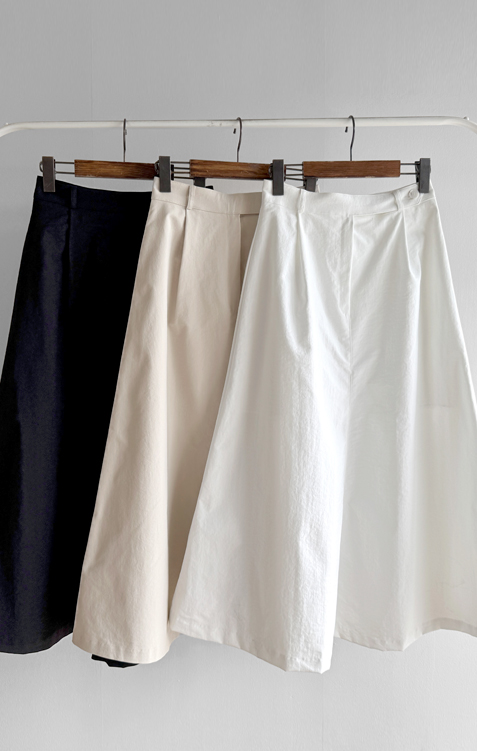 깔끔하면서도 실루엣이 예쁜 A라인 스커트 소개드려요 ^^ 허리 라인에 더해진 턱 디테일이 자연스럽게 볼륨을 만들어주면서 아래로 갈수록 부드럽게 퍼지는 A라인 핏을 완성해주는 아이템이에요. 과하지 않은 디자인으로 상의를 넣어 입었을 때 더욱 단정하게 연출되며 허리부터 밑단까지 떨어지는 라인이 전체적인 비율을 길어 보이게 만들어줍니다. 적당히 여유 있는 기장감으로 부담 없이 착용 가능하며 블라우스, 니트, 티셔츠 등 다양한 상의와 매치하기 좋아 데일리부터 여성스러운 코디까지 활용도 높아요 ♥