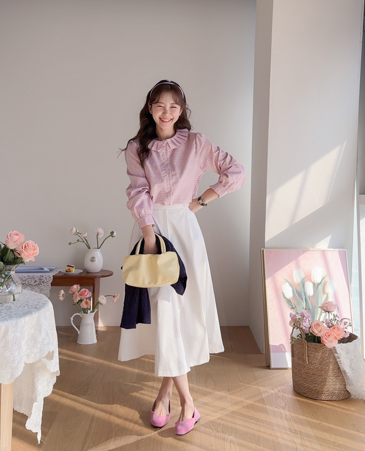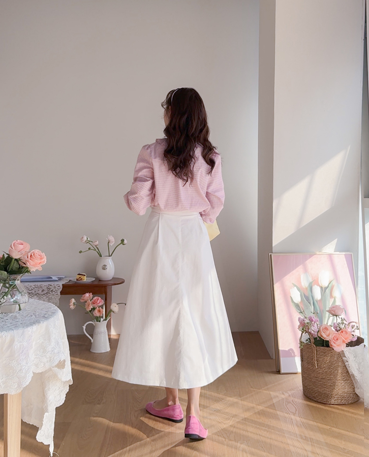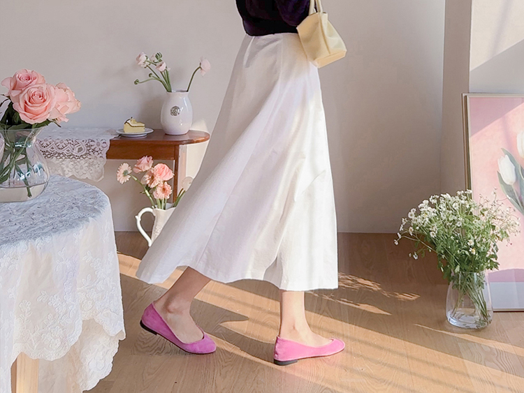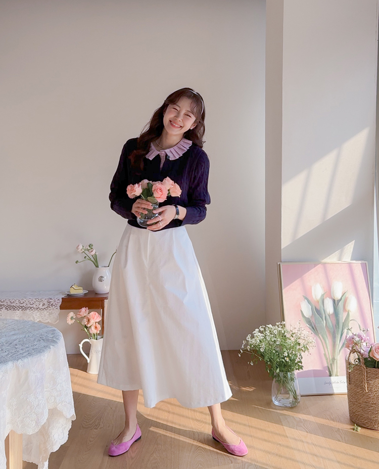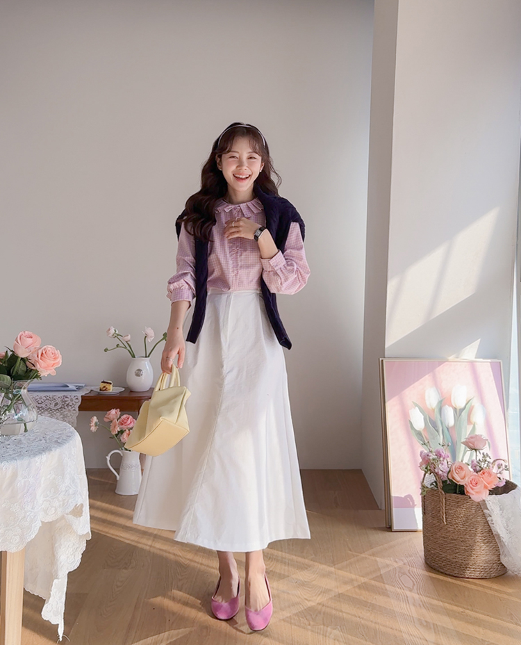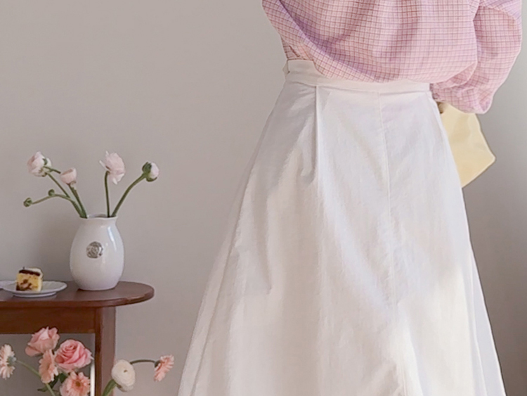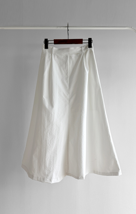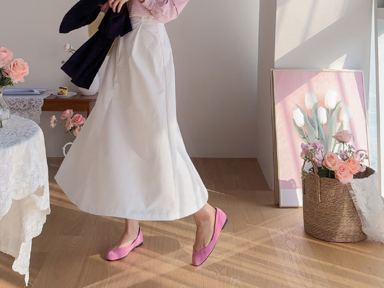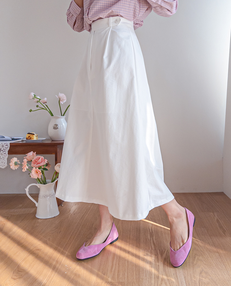 깔끔하면서도 실루엣이 예쁜 A라인 스커트 소개드려요 ^^ 허리 라인에 더해진 턱 디테일이 자연스럽게 볼륨을 만들어주면서 아래로 갈수록 부드럽게 퍼지는 A라인 핏을 완성해주는 아이템이에요. 과하지 않은 디자인으로 상의를 넣어 입었을 때 더욱 단정하게 연출되며 허리부터 밑단까지 떨어지는 라인이 전체적인 비율을 길어 보이게 만들어줍니다. 적당히 여유 있는 기장감으로 부담 없이 착용 가능하며 블라우스, 니트, 티셔츠 등 다양한 상의와 매치하기 좋아 데일리부터 여성스러운 코디까지 활용도 높아요 ♥
