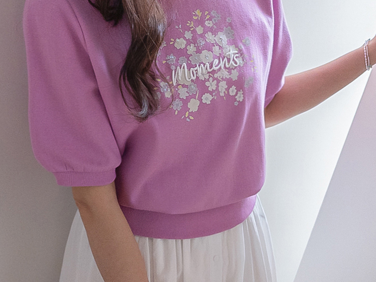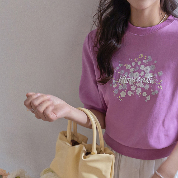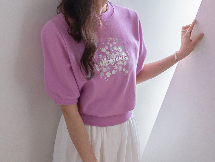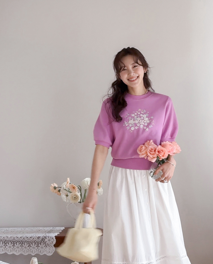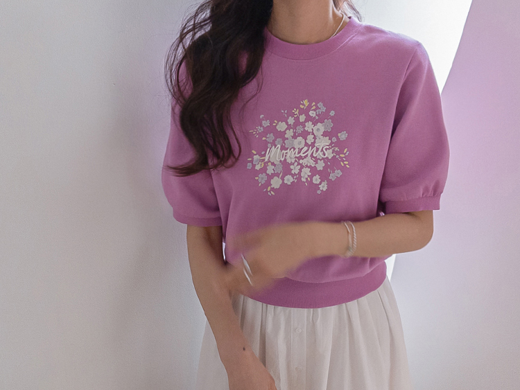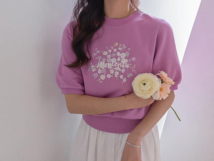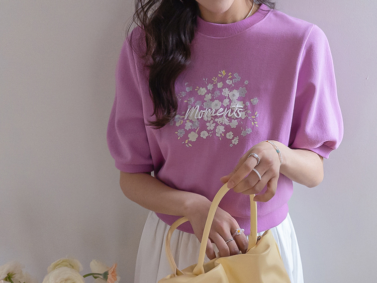 사랑스러운 무드가 돋보이는 반팔 맨투맨 소개드려요 ^^ 전체적으로 여유 있는 핏에 편안하게 입기 좋은 라운드넥 디자인으로 데일리하게 활용하기 좋은 아이템이에요. 앞판에는 잔잔하게 퍼지는 플라워 프린트 위에 레터링 자수가 더해져 프린트와 자수가 어우러진 감성적인 포인트를 완성해주고요, 소매는 은은하게 볼륨이 살아나는 퍼프 쉐입 디자인으로 캐주얼한 맨투맨에 여성스러운 분위기를 더해줍니다. 밑단은 넓게 잡힌 시보리 마감으로 허리라인을 안정감 있게 잡아주면서 자연스럽게 블루종처럼 살짝 잡히는 핏이 연출되어 전체 실루엣을 더 예쁘게 만들어줘요. 데님, 스커트 어디에나 잘 어울려 편하면서도 포인트 주기 좋은 아이템으로 추천드릴게요 ♥