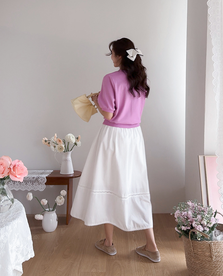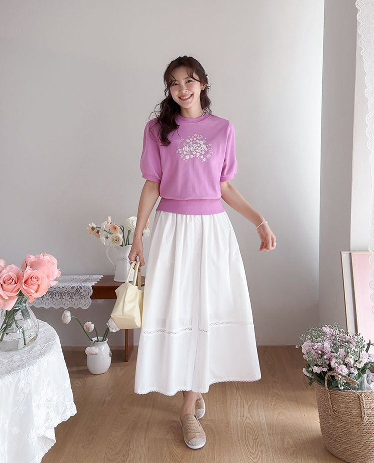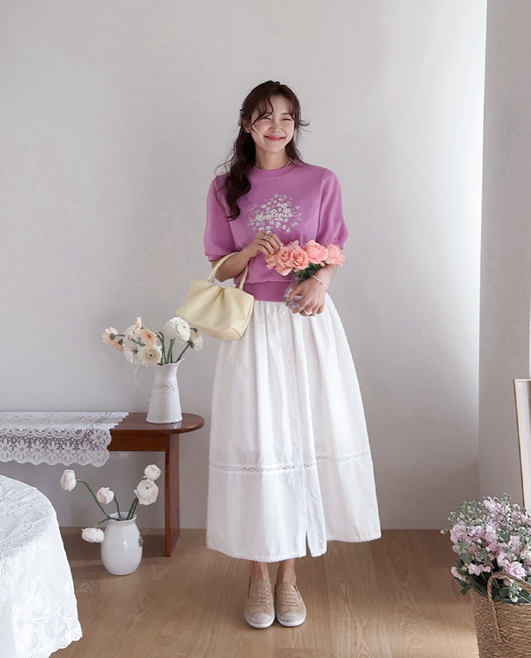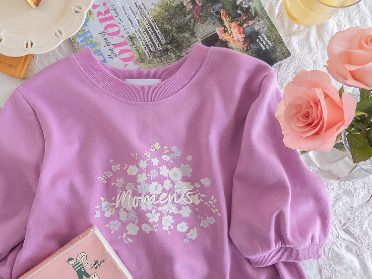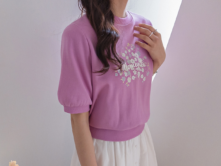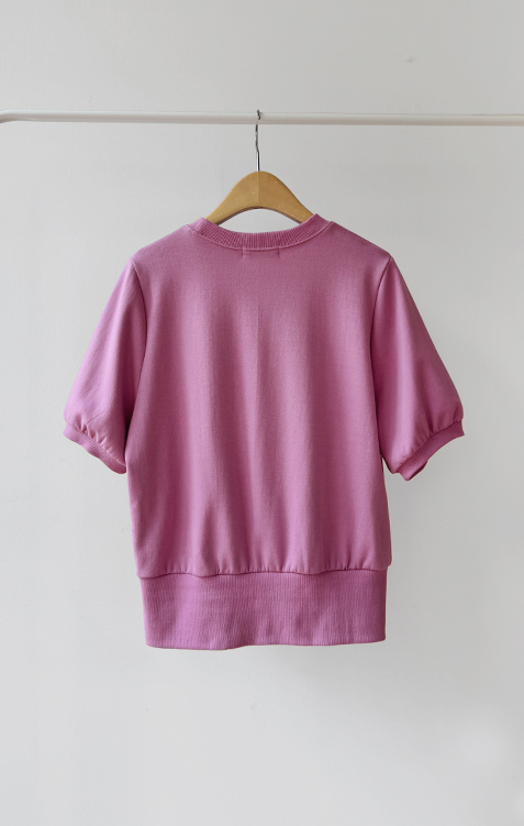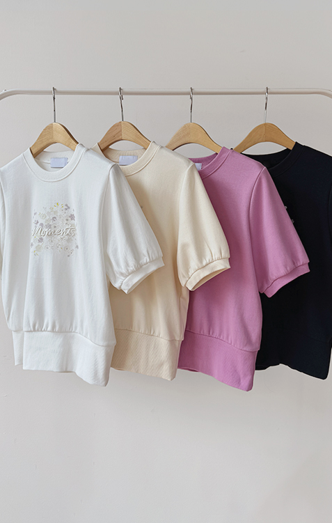 사랑스러운 무드가 돋보이는 반팔 맨투맨 소개드려요 ^^ 전체적으로 여유 있는 핏에 편안하게 입기 좋은 라운드넥 디자인으로 데일리하게 활용하기 좋은 아이템이에요. 앞판에는 잔잔하게 퍼지는 플라워 프린트 위에 레터링 자수가 더해져 프린트와 자수가 어우러진 감성적인 포인트를 완성해주고요, 소매는 은은하게 볼륨이 살아나는 퍼프 쉐입 디자인으로 캐주얼한 맨투맨에 여성스러운 분위기를 더해줍니다. 밑단은 넓게 잡힌 시보리 마감으로 허리라인을 안정감 있게 잡아주면서 자연스럽게 블루종처럼 살짝 잡히는 핏이 연출되어 전체 실루엣을 더 예쁘게 만들어줘요. 데님, 스커트 어디에나 잘 어울려 편하면서도 포인트 주기 좋은 아이템으로 추천드릴게요 ♥