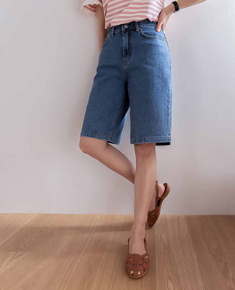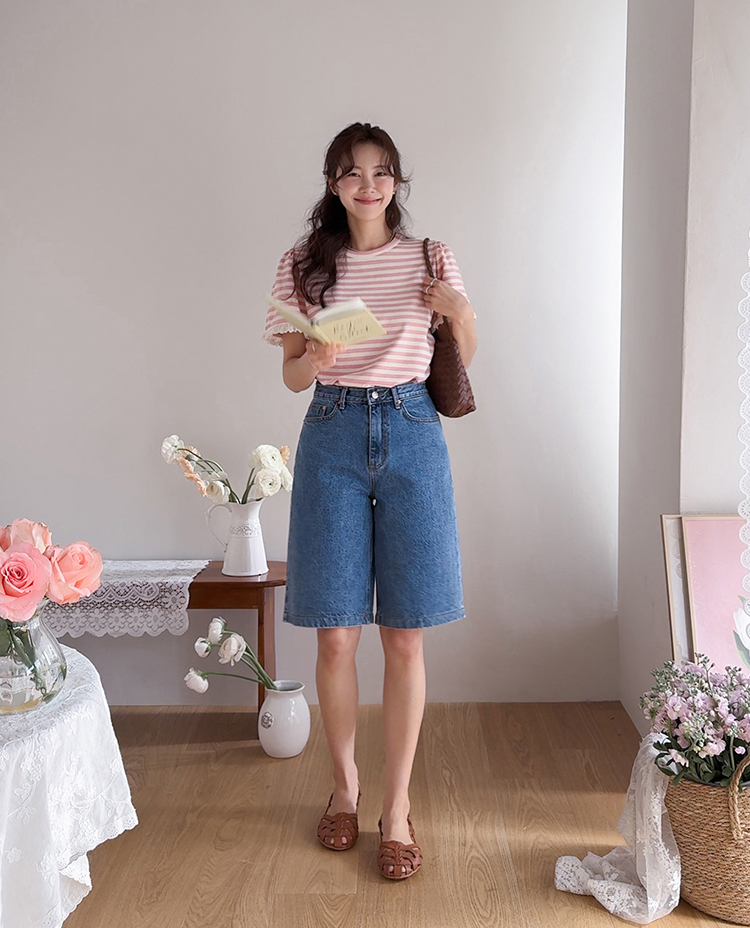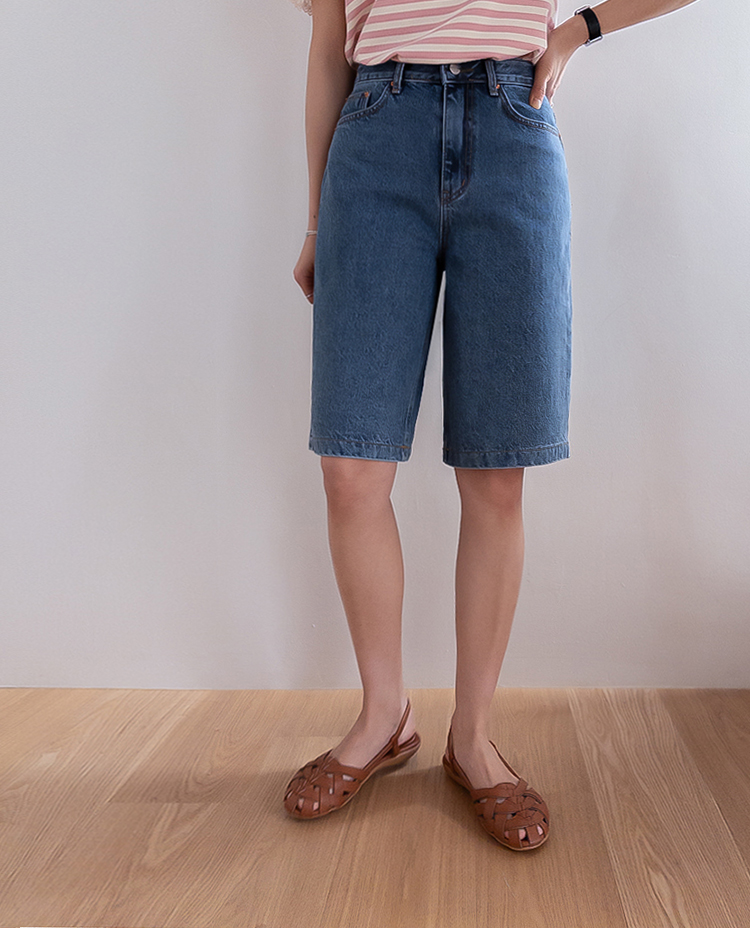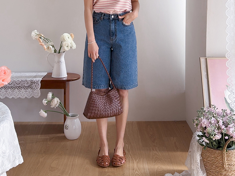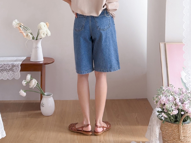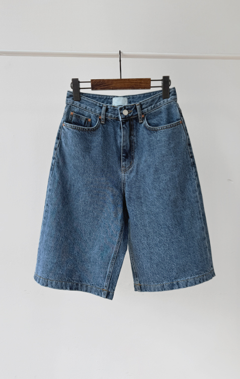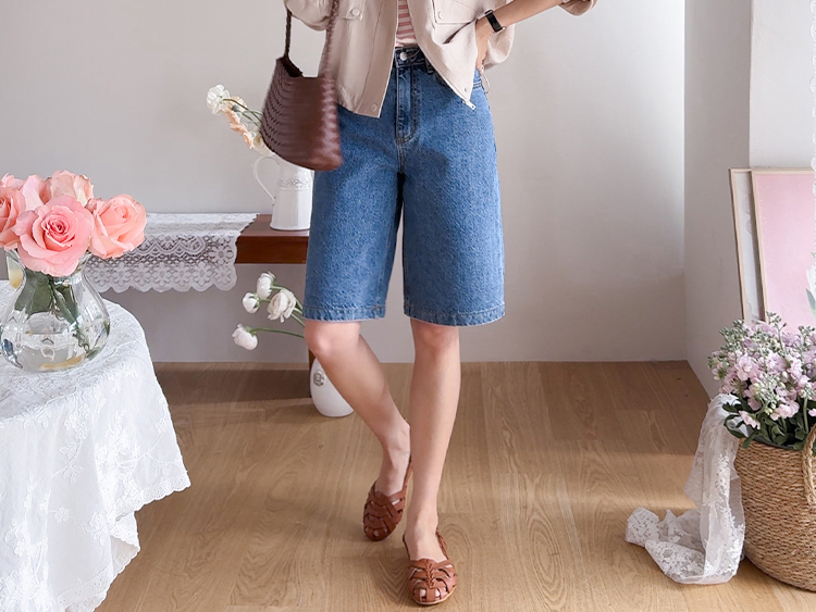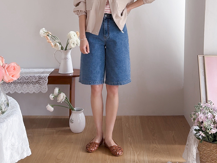 가볍고 경쾌하게 즐기기 좋은 데님 버뮤다 팬츠 소개드려요 ^^ 전체적으로 허리와 힙은 안정감 있게 잡아주고 밑단까지 여유 있게 일자로 떨어지는 실루엣으로 부담 없이 편안하게 입기 좋은 아이템이에요. 기장은 무릎 위 정도로 내려오는 버뮤다 길이감으로 너무 짧지 않아 데일리하게 착용하기 좋고 다리 라인도 한층 더 슬림하고 길어 보이게 연출해줘요. 데님 특유의 탄탄한 소재감이 전체 핏을 깔끔하게 잡아주어 입었을 때 벙벙하기보다 정돈된 캐주얼 무드가 느껴지고요, 티셔츠, 셔츠, 니트 어디에나 잘 어울려 여름 시즌 데일리룩으로 활용하기 좋은 데님 버뮤다 팬츠로 추천드릴게요 ♥
