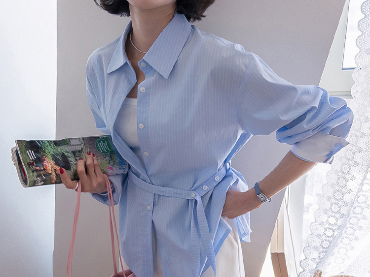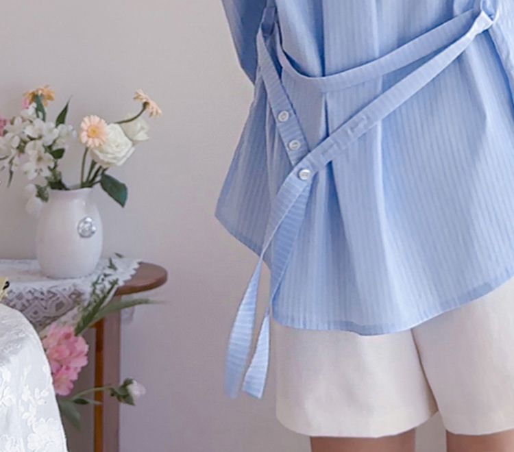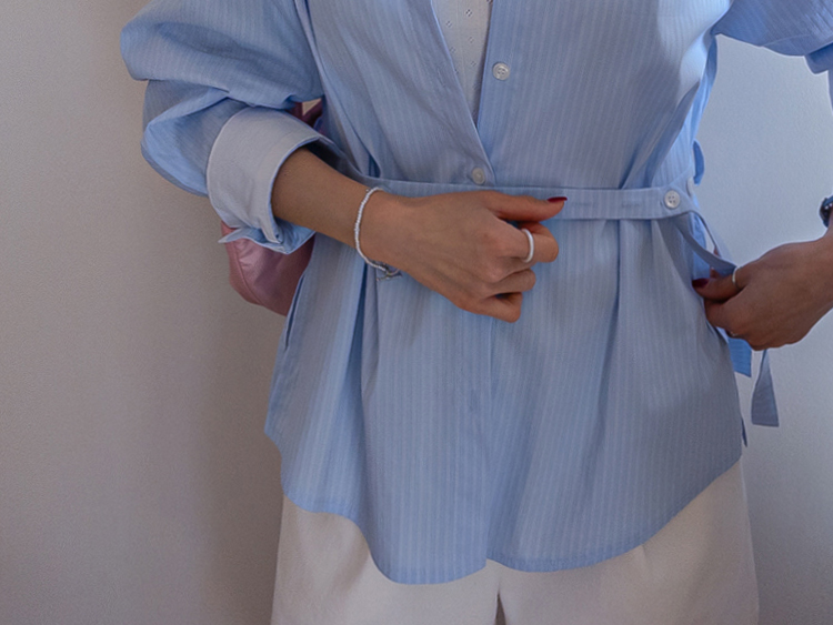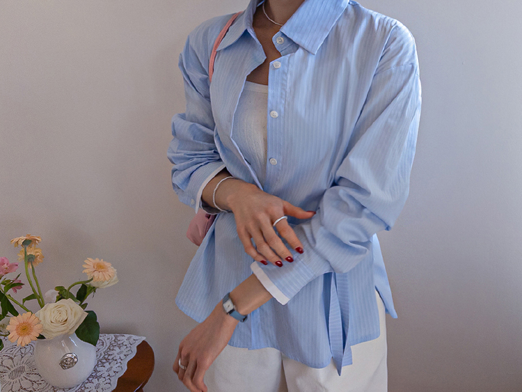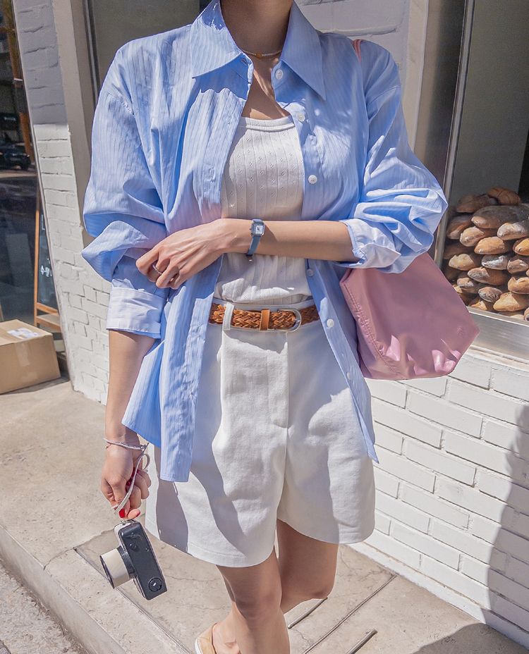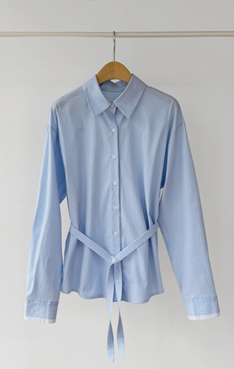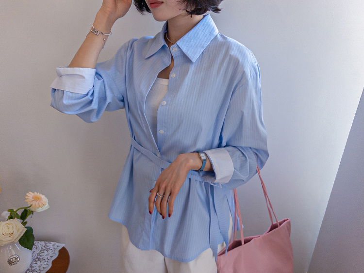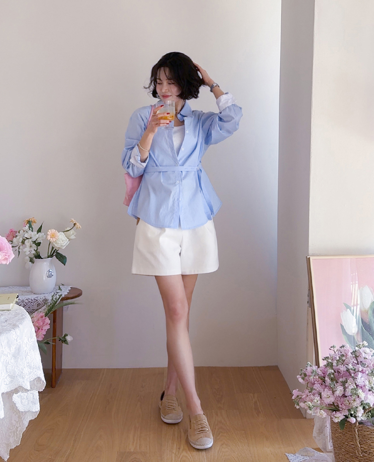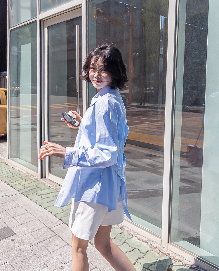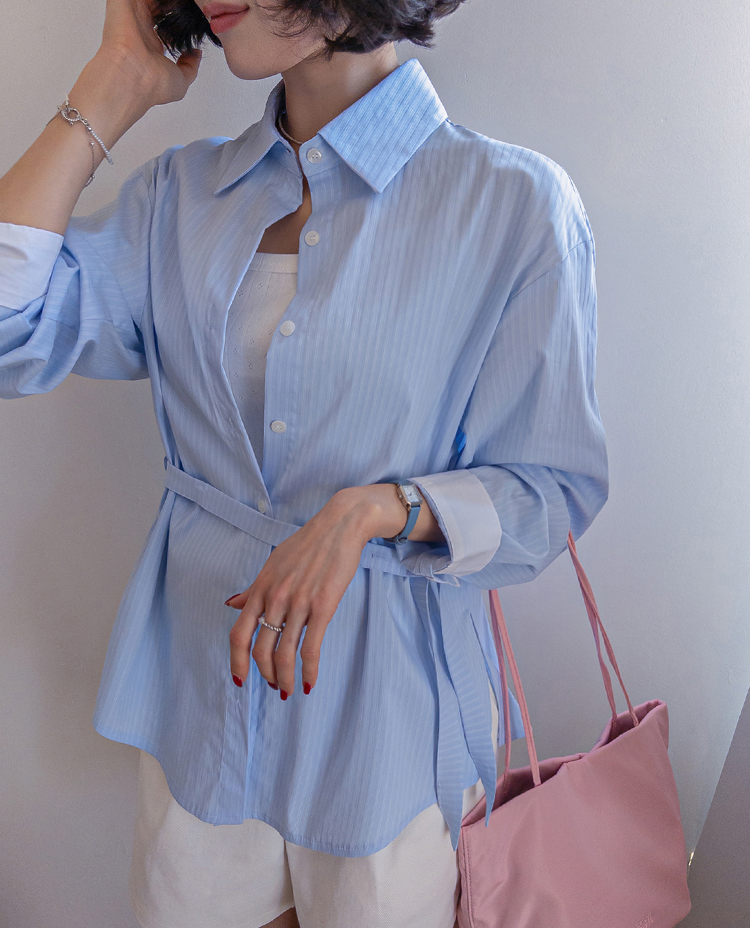 기본 셔츠에 디테일을 더한 스트라이프 셔츠 소개드려요 ^^ 잔잔한 스트라이프 패턴으로 단정하고 시원한 분위기를 연출해주며 가볍게 걸쳐도 차려입은 듯 깔끔한 무드가 느껴지는 아이템이에요. 소매 끝에는 화이트 배색이 살짝 보이도록 디자인되어 은은하게 포인트가 되어주고, 소매를 롤업하면 커프스 안쪽 화이트 배색이 드러나 더욱 센스 있게 연출할 수 있어요. 허리에는 스트랩 디테일이 더해져 앞쪽으로 가볍게 묶어 라인을 잡아 연출하거나, 셔츠를 자연스럽게 풀어 입은 뒤 뒤로 묶어 실루엣에 변화를 줄 수 있어요. 기본 셔츠처럼 편하게 입으면서도 연출에 따라 분위기를 바꿀 수 있어 활용도 높은 아이템으로 추천드릴게요 ♥