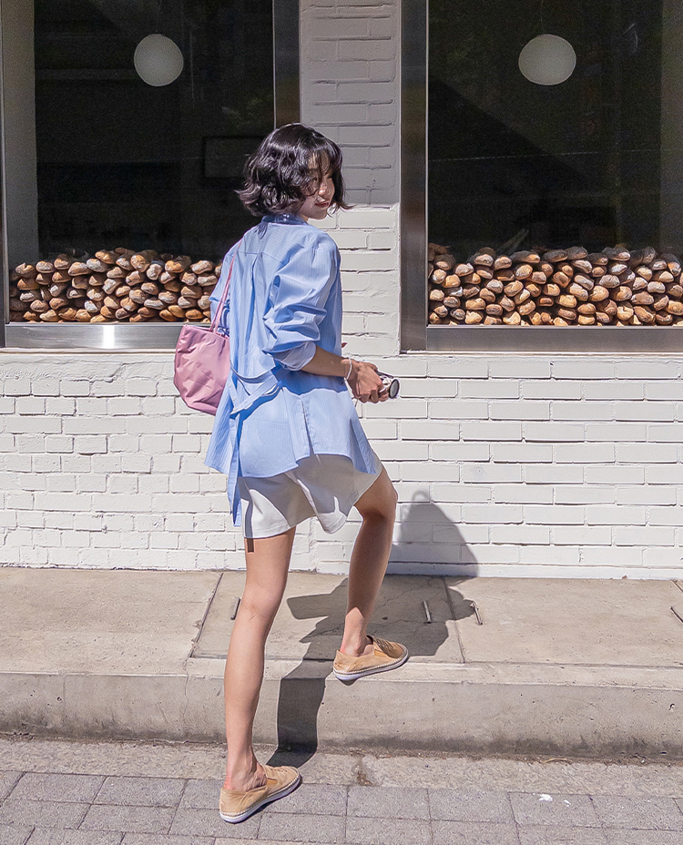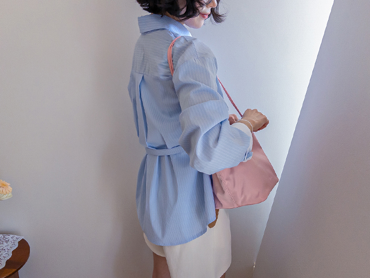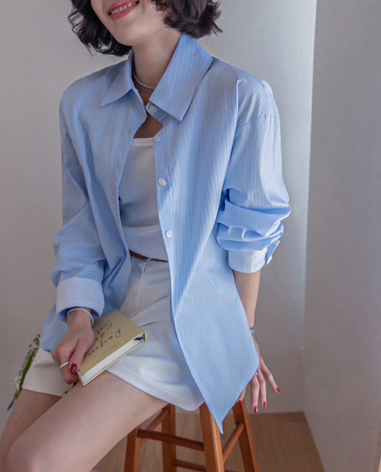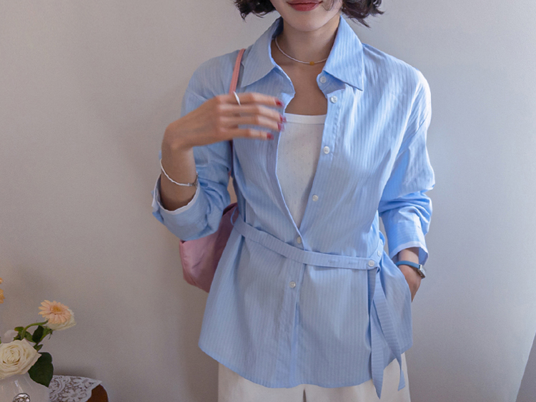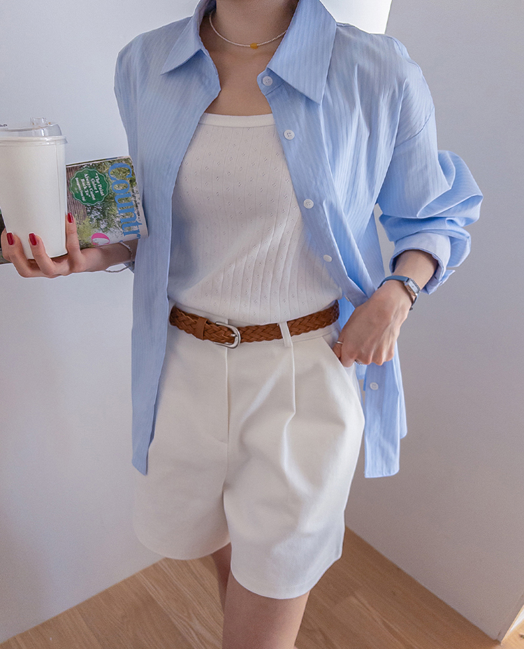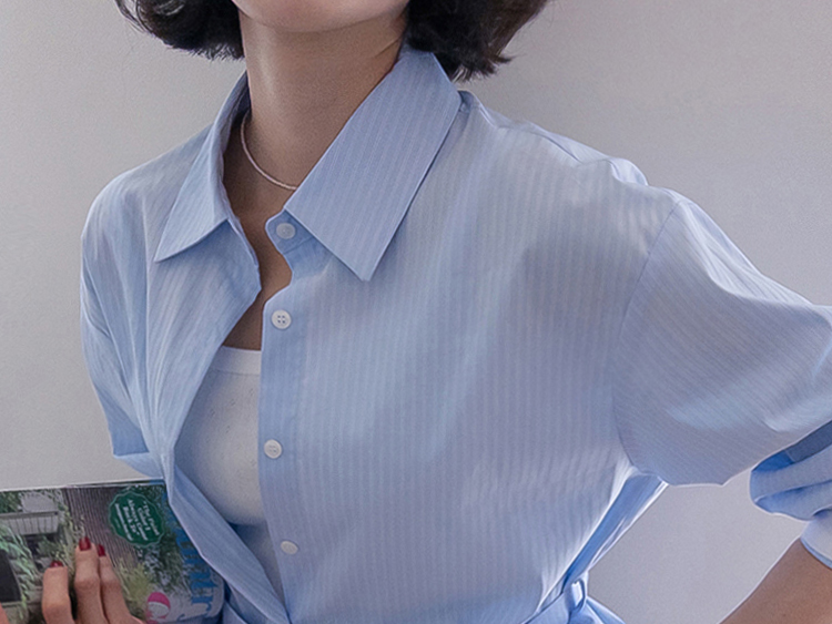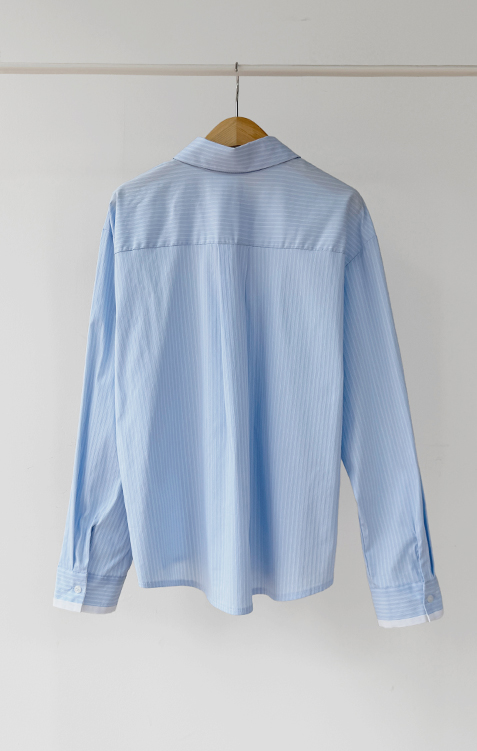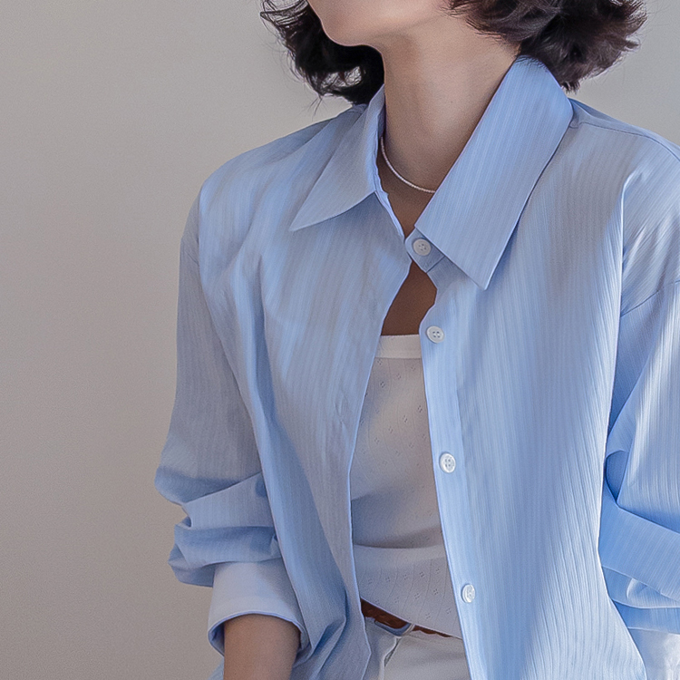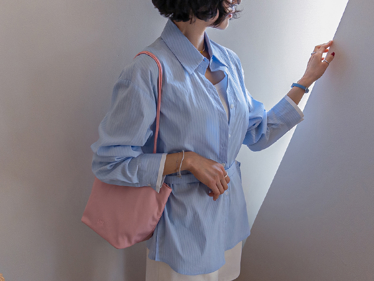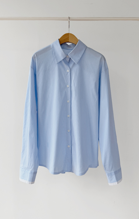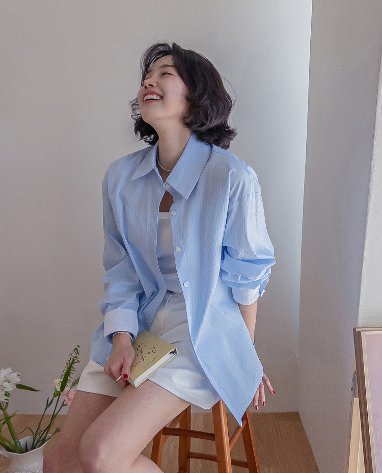 기본 셔츠에 디테일을 더한 스트라이프 셔츠 소개드려요 ^^ 잔잔한 스트라이프 패턴으로 단정하고 시원한 분위기를 연출해주며 가볍게 걸쳐도 차려입은 듯 깔끔한 무드가 느껴지는 아이템이에요. 소매 끝에는 화이트 배색이 살짝 보이도록 디자인되어 은은하게 포인트가 되어주고, 소매를 롤업하면 커프스 안쪽 화이트 배색이 드러나 더욱 센스 있게 연출할 수 있어요. 허리에는 스트랩 디테일이 더해져 앞쪽으로 가볍게 묶어 라인을 잡아 연출하거나, 셔츠를 자연스럽게 풀어 입은 뒤 뒤로 묶어 실루엣에 변화를 줄 수 있어요. 기본 셔츠처럼 편하게 입으면서도 연출에 따라 분위기를 바꿀 수 있어 활용도 높은 아이템으로 추천드릴게요 ♥