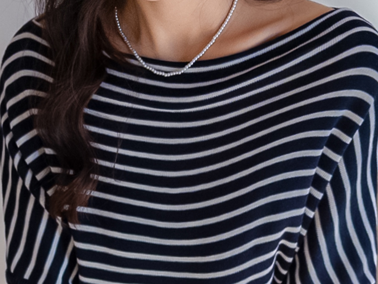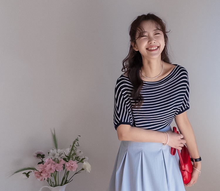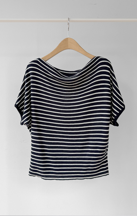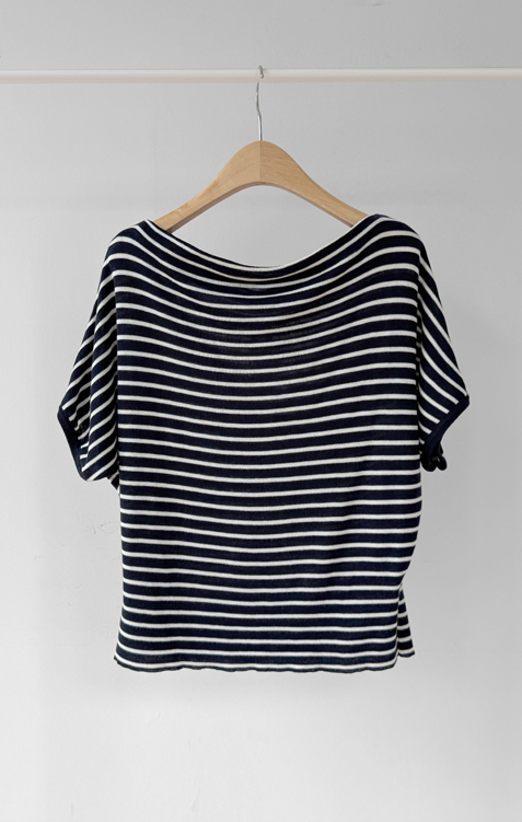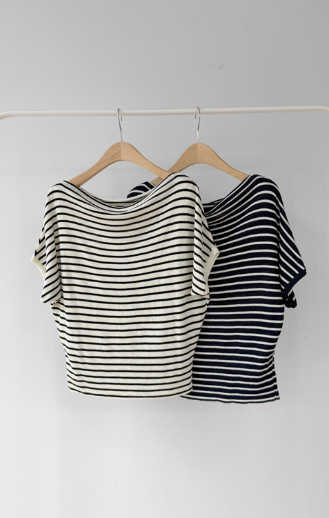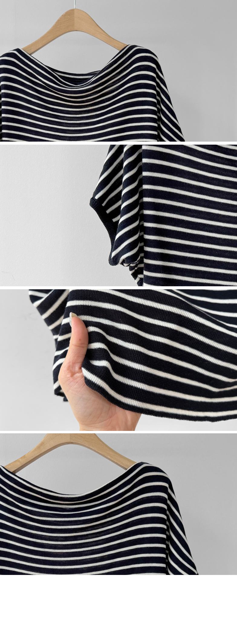【余裕のムードを生かすボートネックライン】【自然に流れるドレープシルエット】【快適なフィットのルーズな半そでニット】【デイリーで活用も高いストライプパタン】