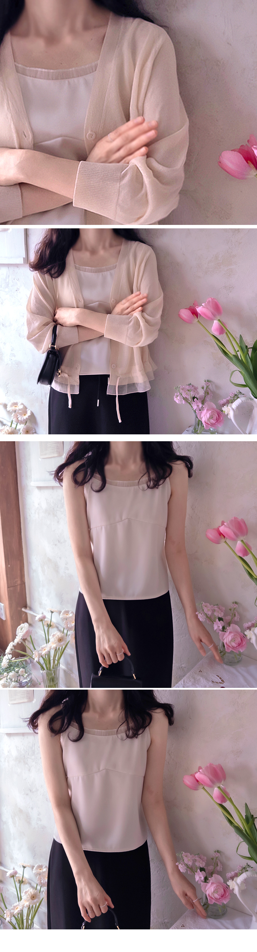 가디건에오 아우터에도~ 정말 잘 만든 나시 탑 이였어요~ 살짝 실키한 소재감으로 적당한 두께감이라 자연스러운 웨이브에 클린하게 떨어지는 핏감이 ~ 사이즈 프리로 55-66까지 좋으시구요~ |