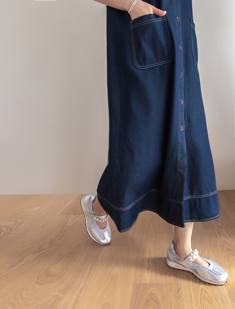 首页 > ドレス > 【肩ひも長さ調節】 リネットステッチディテールフロントボタン Aライン ロングワンピース [size:F(55~66)]