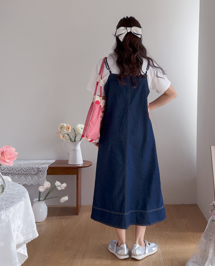 【肩ひも長さ調節】 リネットステッチディテールフロントボタン Aライン ロングワンピース [size:F(55~66)]