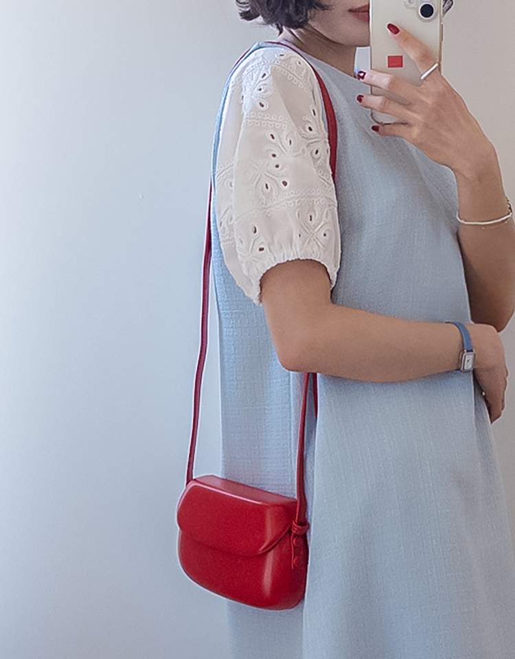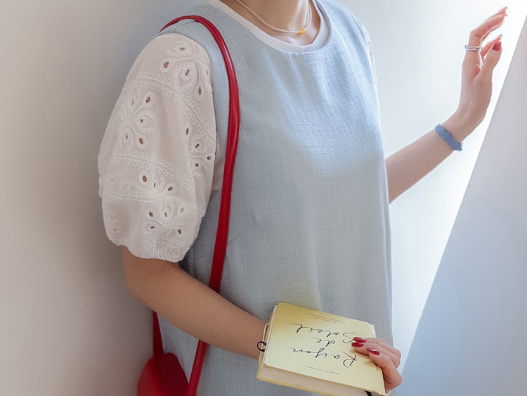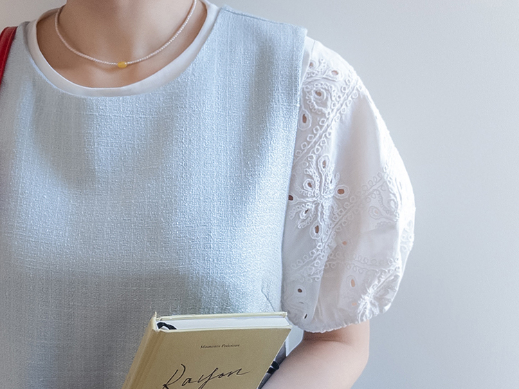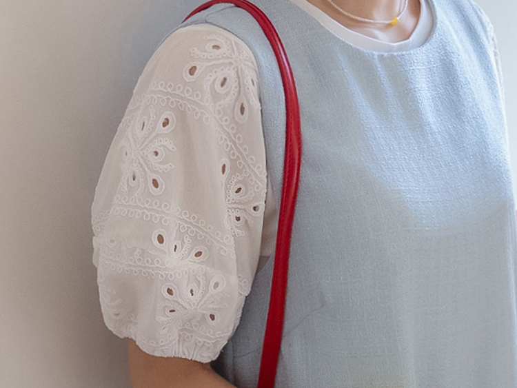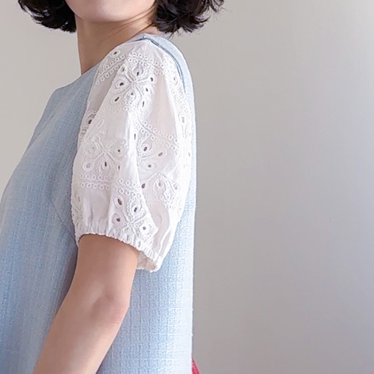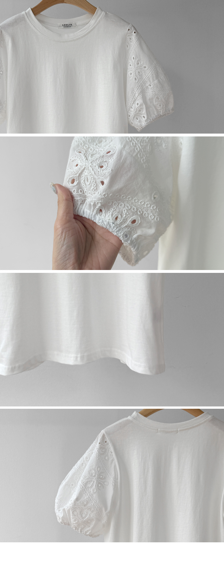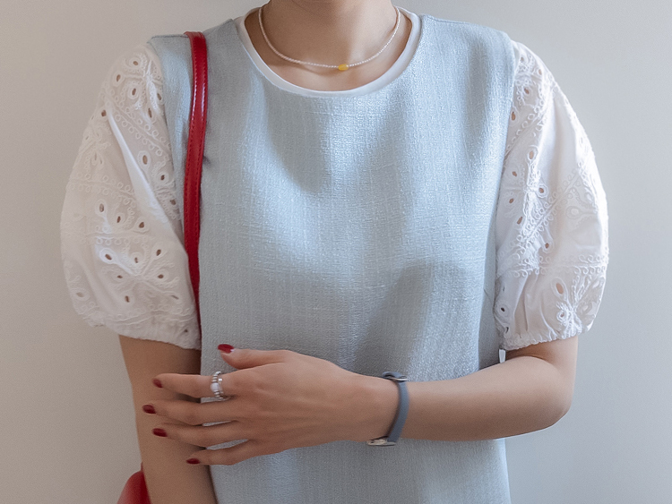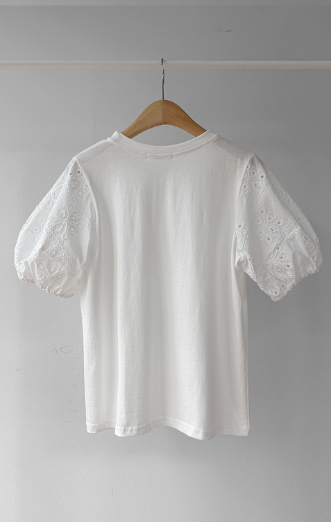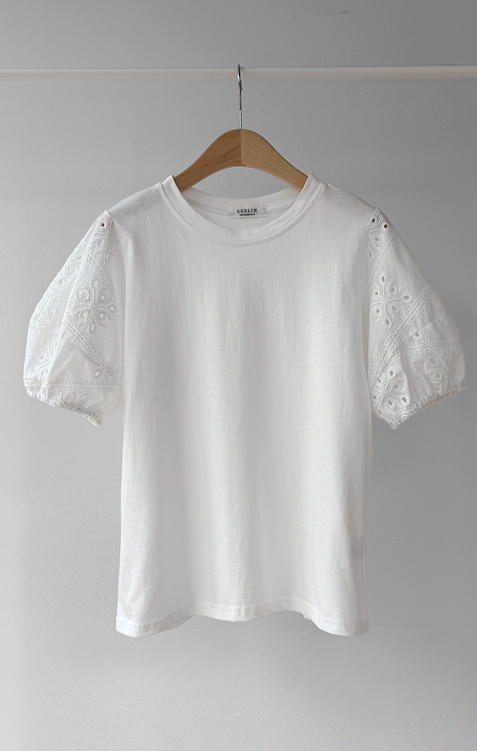 베이직하면서도 포인트가 살아있는 퍼프 티셔츠 소개드려요 ^^ 몸판은 깔끔한 기본 티셔츠 디자인에 소매 부분에 펀칭 레이스 원단을 더해 은은하게 여성스러운 분위기를 살려준 아이템이에요. 소매는 자연스럽게 볼륨이 잡히는 퍼프 실루엣으로 팔라인을 부드럽게 커버해주면서 입었을 때 더욱 사랑스러운 핏을 만들어주고요, 레이스 특유의 디테일이 더해져 단독으로도 충분히 포인트가 되면서 원피스나 베스트와 레이어드했을 때도 소매가 예쁘게 드러나 활용도가 높아요. 데님, 스커트, 원피스 이너까지 다양하게 매치하기 좋은 데일리 포인트 티셔츠로 추천드릴게요 ♥