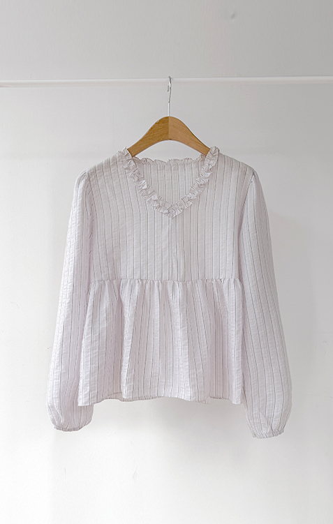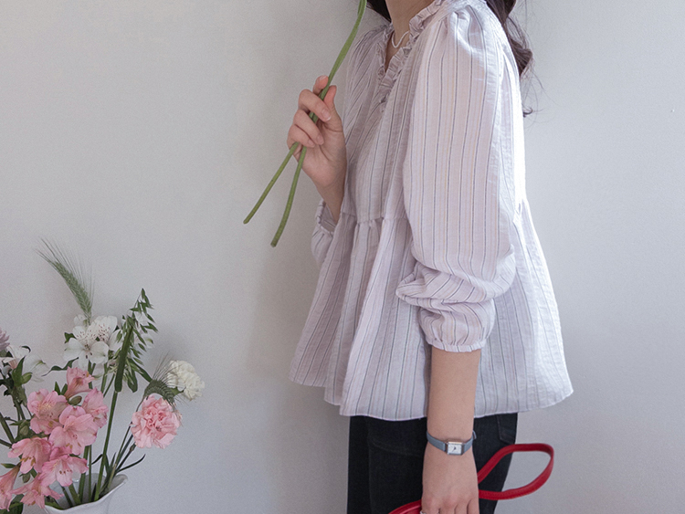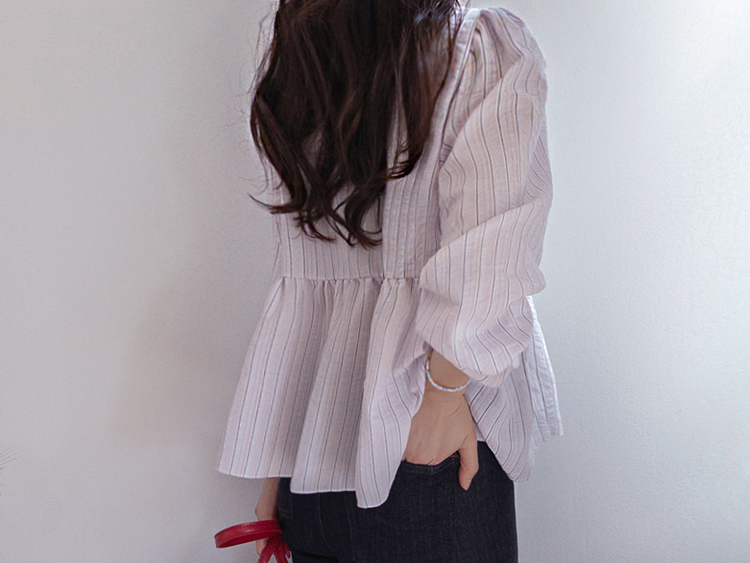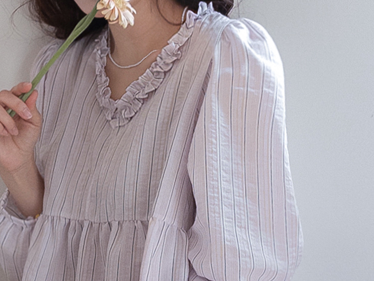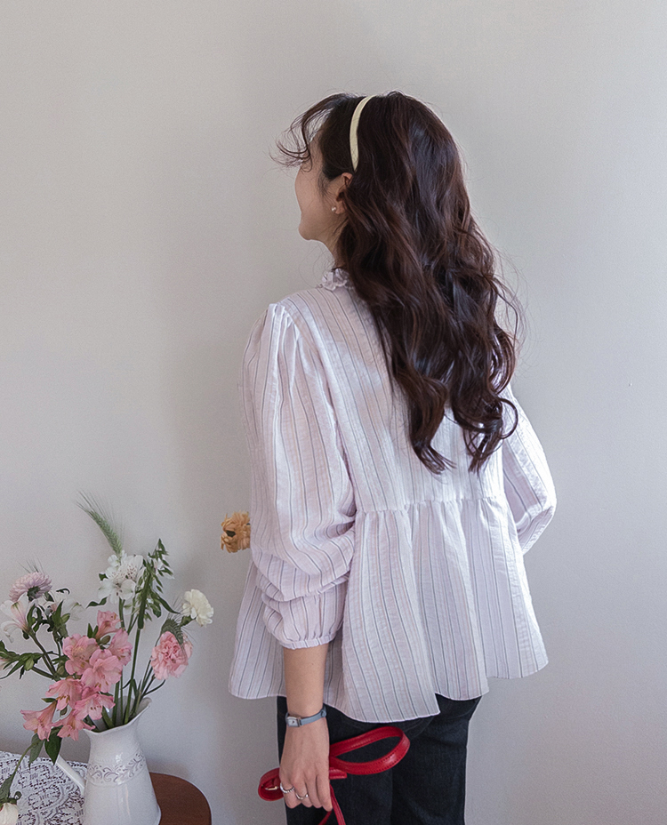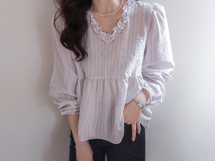 사랑스러운 분위기가 느껴지는 스트라이프 블라우스 소개드려요 ^^ 잔잔한 스트라이프 원단으로 과하지 않게 포인트가 되어주면서 전체적으로 한층 더 여리하고 여성스러운 무드를 연출해주는 아이템이에요. 넥라인은 브이넥 디자인으로 목선이 답답하지 않게 드러나고, 그 라인을 따라 더해진 제원단 프릴 디테일이 얼굴선을 부드럽고 사랑스럽게 살려줘요. 가슴 아래에는 절개선을 넣어 상체 라인을 한 번 정리해주고, 그 아래로는 셔링을 잡아 자연스럽게 훌이 지는 실루엣으로 체형을 부드럽게 커버하면서 여리한 핏을 완성해줍니다. 소매에도 자연스럽게 볼륨이 살아 있어 전체적으로 로맨틱한 분위기가 느껴지며, 앞모습은 물론 뒷모습까지 예쁘게 떨어지는 포인트 블라우스로 추천드릴게요 ♥