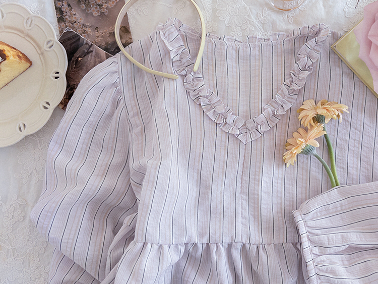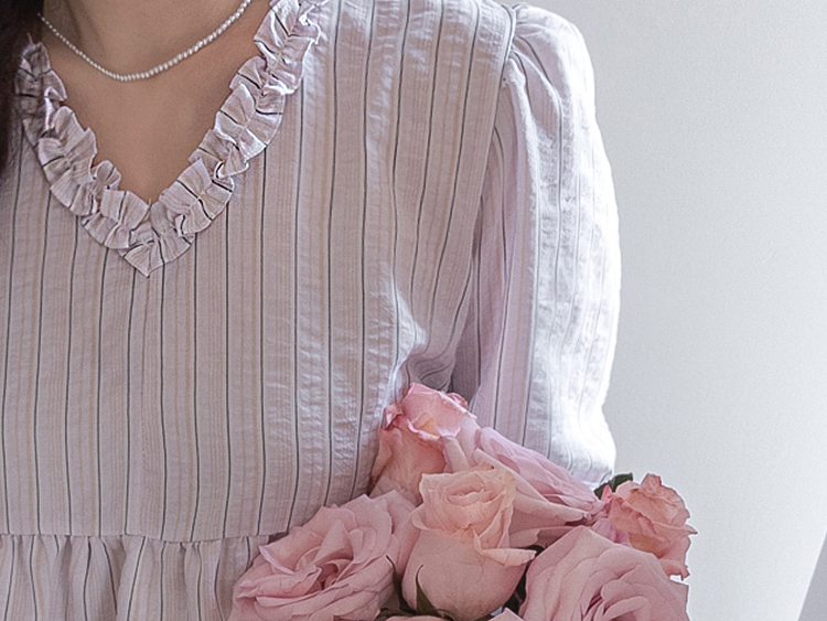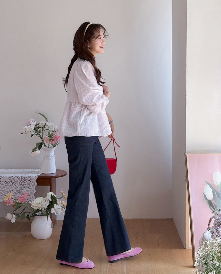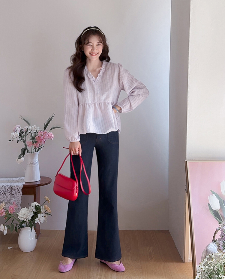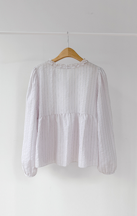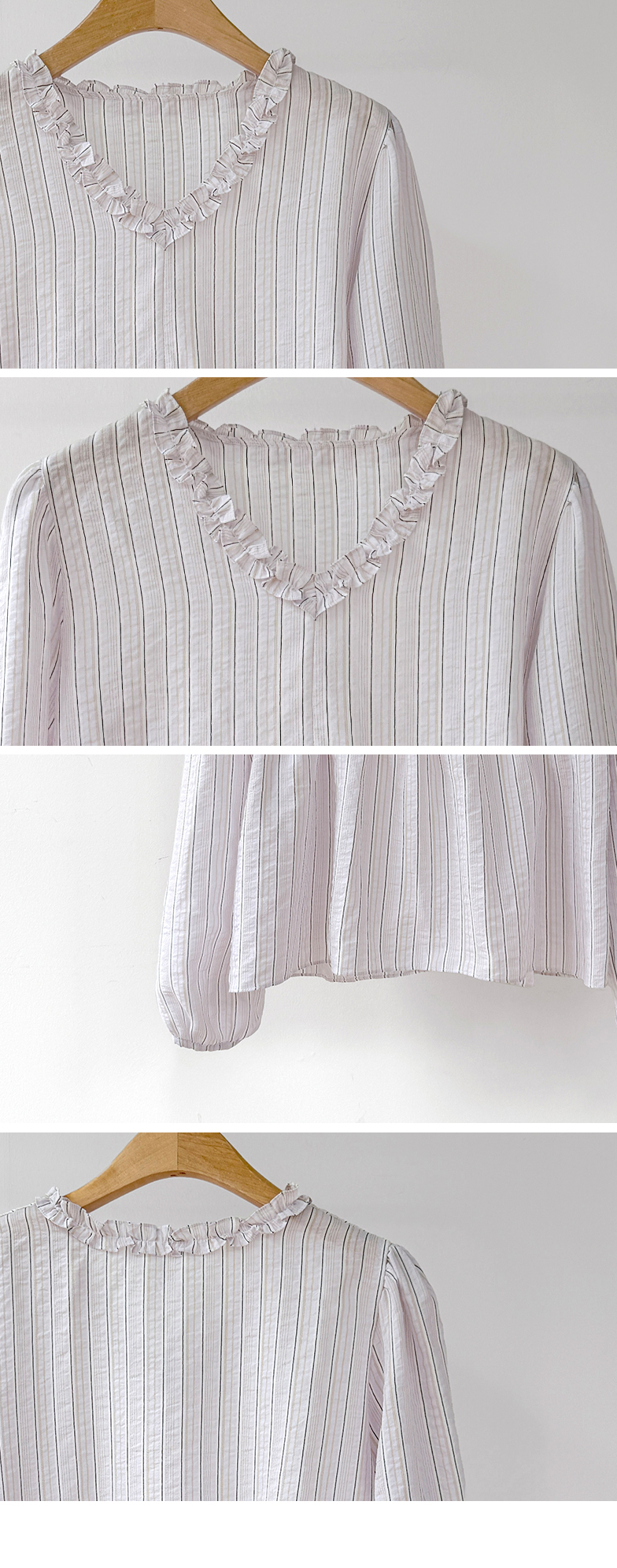 사랑스러운 분위기가 느껴지는 스트라이프 블라우스 소개드려요 ^^ 잔잔한 스트라이프 원단으로 과하지 않게 포인트가 되어주면서 전체적으로 한층 더 여리하고 여성스러운 무드를 연출해주는 아이템이에요. 넥라인은 브이넥 디자인으로 목선이 답답하지 않게 드러나고, 그 라인을 따라 더해진 제원단 프릴 디테일이 얼굴선을 부드럽고 사랑스럽게 살려줘요. 가슴 아래에는 절개선을 넣어 상체 라인을 한 번 정리해주고, 그 아래로는 셔링을 잡아 자연스럽게 훌이 지는 실루엣으로 체형을 부드럽게 커버하면서 여리한 핏을 완성해줍니다. 소매에도 자연스럽게 볼륨이 살아 있어 전체적으로 로맨틱한 분위기가 느껴지며, 앞모습은 물론 뒷모습까지 예쁘게 떨어지는 포인트 블라우스로 추천드릴게요 ♥