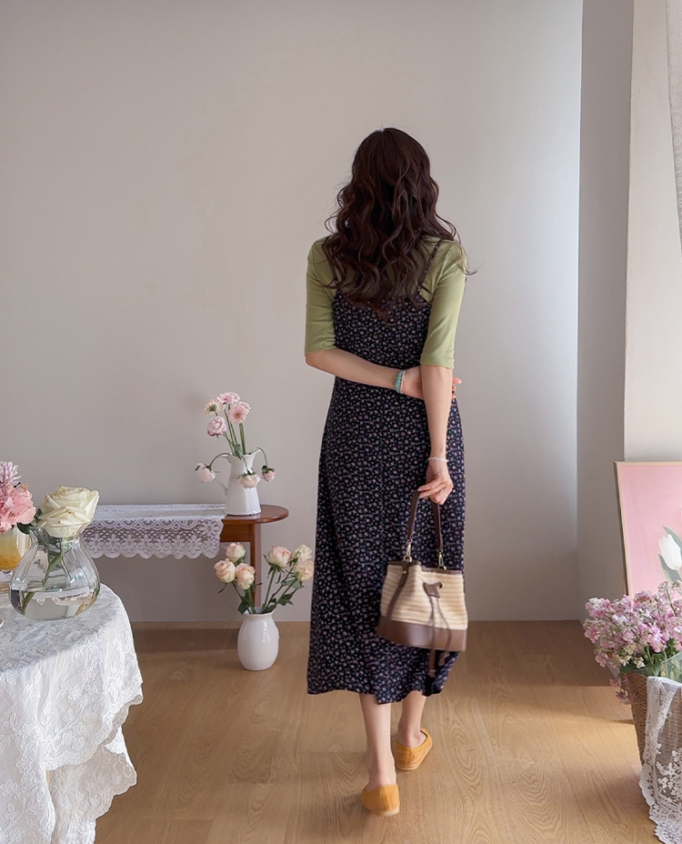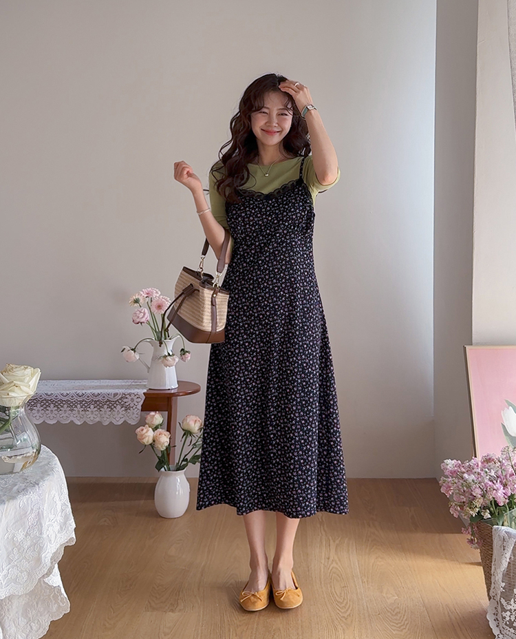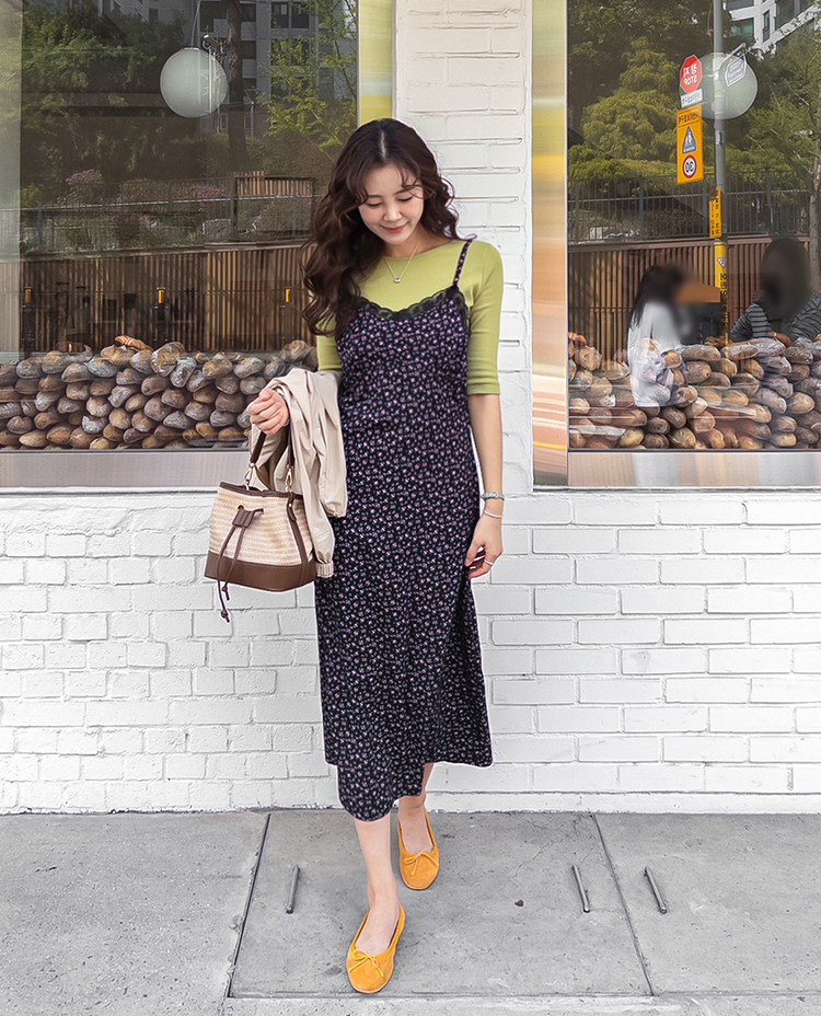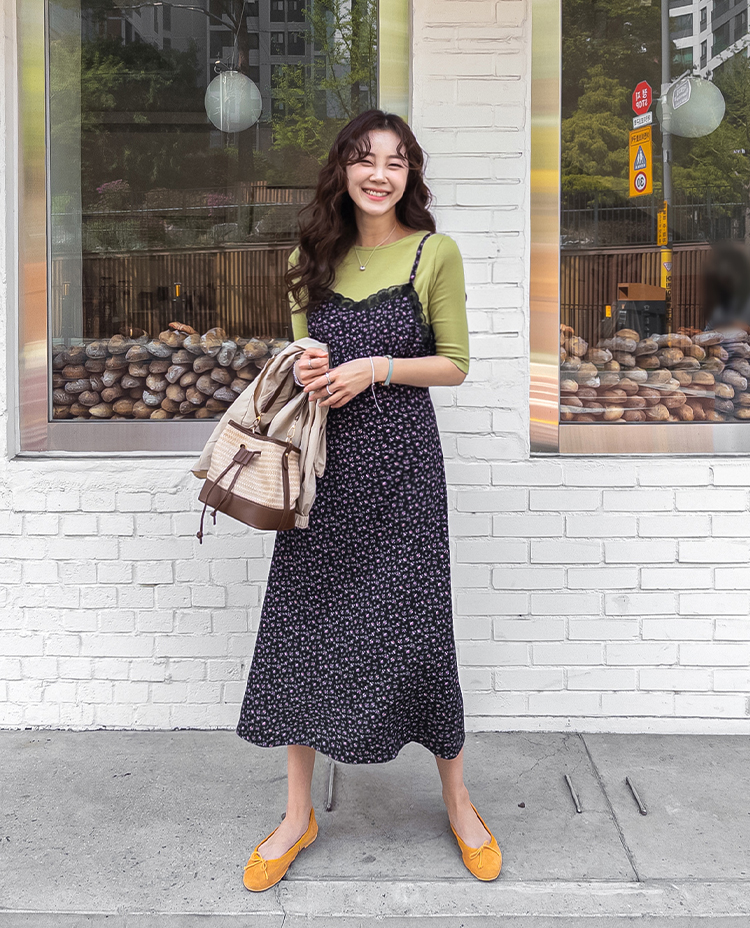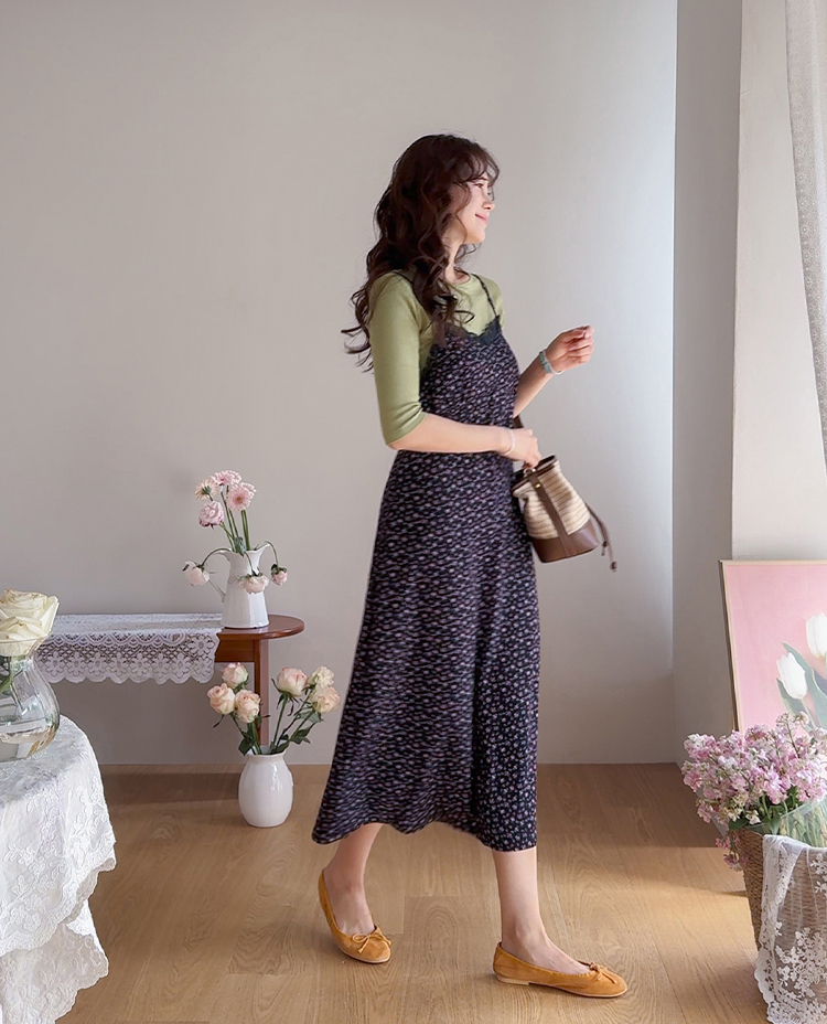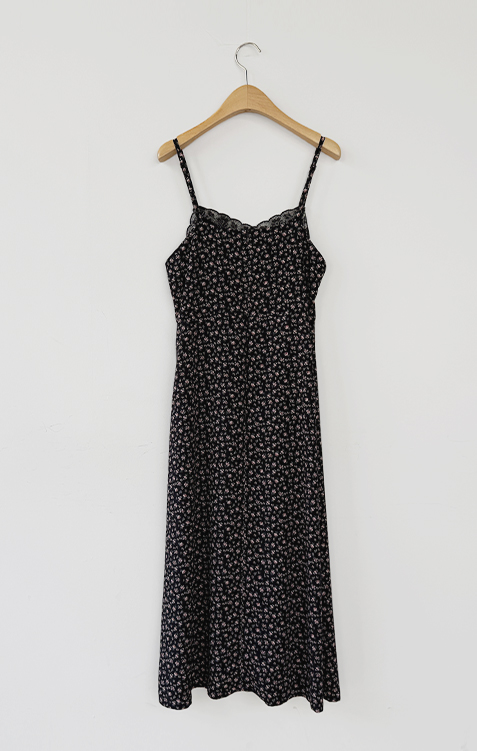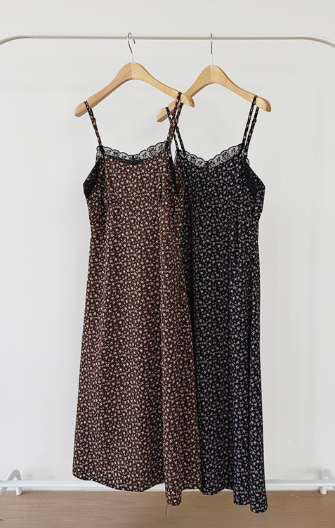 여리하고 빈티지한 무드가 느껴지는 잔꽃 레이스 슬립 원피스예요 :) 전체적으로 은은한 컬러감 위에 촘촘하게 들어간 잔꽃 프린트가 더해져 과하지 않으면서도 분위기 있게 포인트가 되어주고, 입었을 때 자연스럽게 감성적인 무드가 살아나는 아이템이에요. 넥라인은 앞가슴 라인을 따라 레이스가 둘러진 디자인으로 단독으로 입었을 때도 밋밋하지 않고 은은하게 여성스러운 포인트를 더해줘요 ♡ 가슴 아래부터는 타이트하지 않게 떨어지면서 자연스럽게 훌이 퍼지는 실루엣이라 바디 라인을 부드럽게 커버해주고 걸을 때마다 살짝씩 흐르는 라인이 예쁘게 연출돼요. 어깨끈은 길이 조절이 가능한 스트랩으로 체형에 맞게 핏을 조절해서 착용하실 수 있어요. 티셔츠나 블라우스 위에 레이어드하면 데일리하게 입기 좋고, 단독으로 입고 가디건만 가볍게 걸쳐줘도 여리한 분위기로 완성되는 아이템이에요 :) 계절에 따라 다양한 스타일링이 가능한 활용도 높은 원피스로 추천드릴게요 ✿