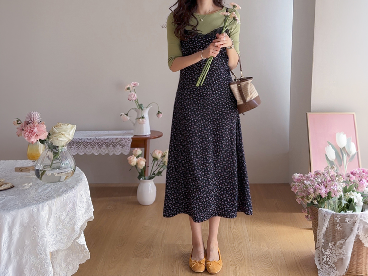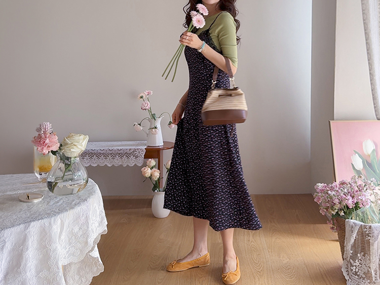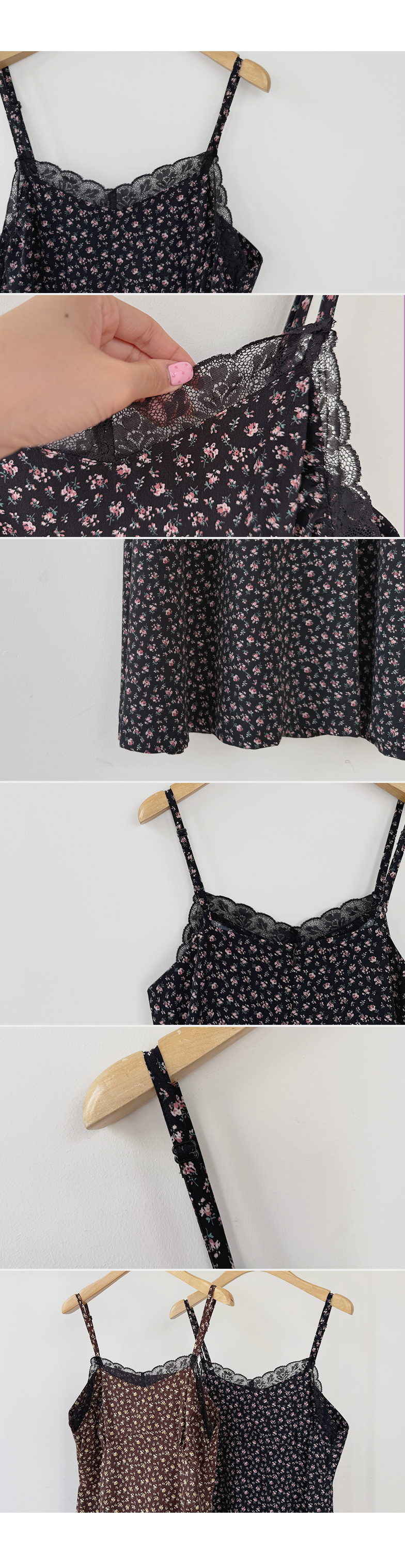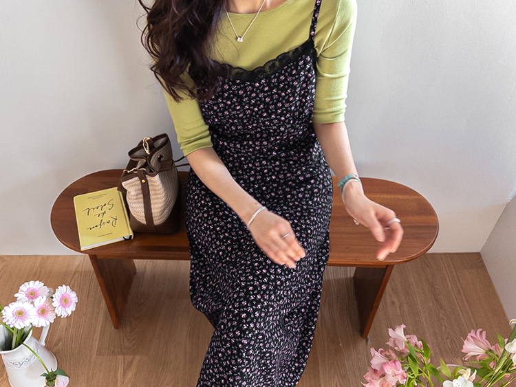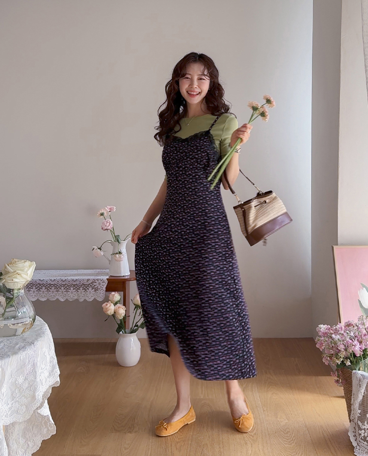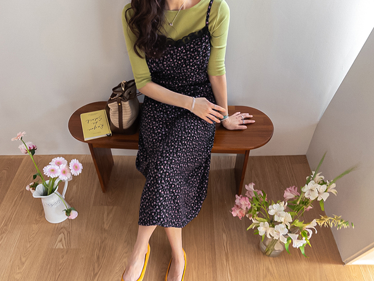 여리하고 빈티지한 무드가 느껴지는 잔꽃 레이스 슬립 원피스예요 :) 전체적으로 은은한 컬러감 위에 촘촘하게 들어간 잔꽃 프린트가 더해져 과하지 않으면서도 분위기 있게 포인트가 되어주고, 입었을 때 자연스럽게 감성적인 무드가 살아나는 아이템이에요. 넥라인은 앞가슴 라인을 따라 레이스가 둘러진 디자인으로 단독으로 입었을 때도 밋밋하지 않고 은은하게 여성스러운 포인트를 더해줘요 ♡ 가슴 아래부터는 타이트하지 않게 떨어지면서 자연스럽게 훌이 퍼지는 실루엣이라 바디 라인을 부드럽게 커버해주고 걸을 때마다 살짝씩 흐르는 라인이 예쁘게 연출돼요. 어깨끈은 길이 조절이 가능한 스트랩으로 체형에 맞게 핏을 조절해서 착용하실 수 있어요. 티셔츠나 블라우스 위에 레이어드하면 데일리하게 입기 좋고, 단독으로 입고 가디건만 가볍게 걸쳐줘도 여리한 분위기로 완성되는 아이템이에요 :) 계절에 따라 다양한 스타일링이 가능한 활용도 높은 원피스로 추천드릴게요 ✿