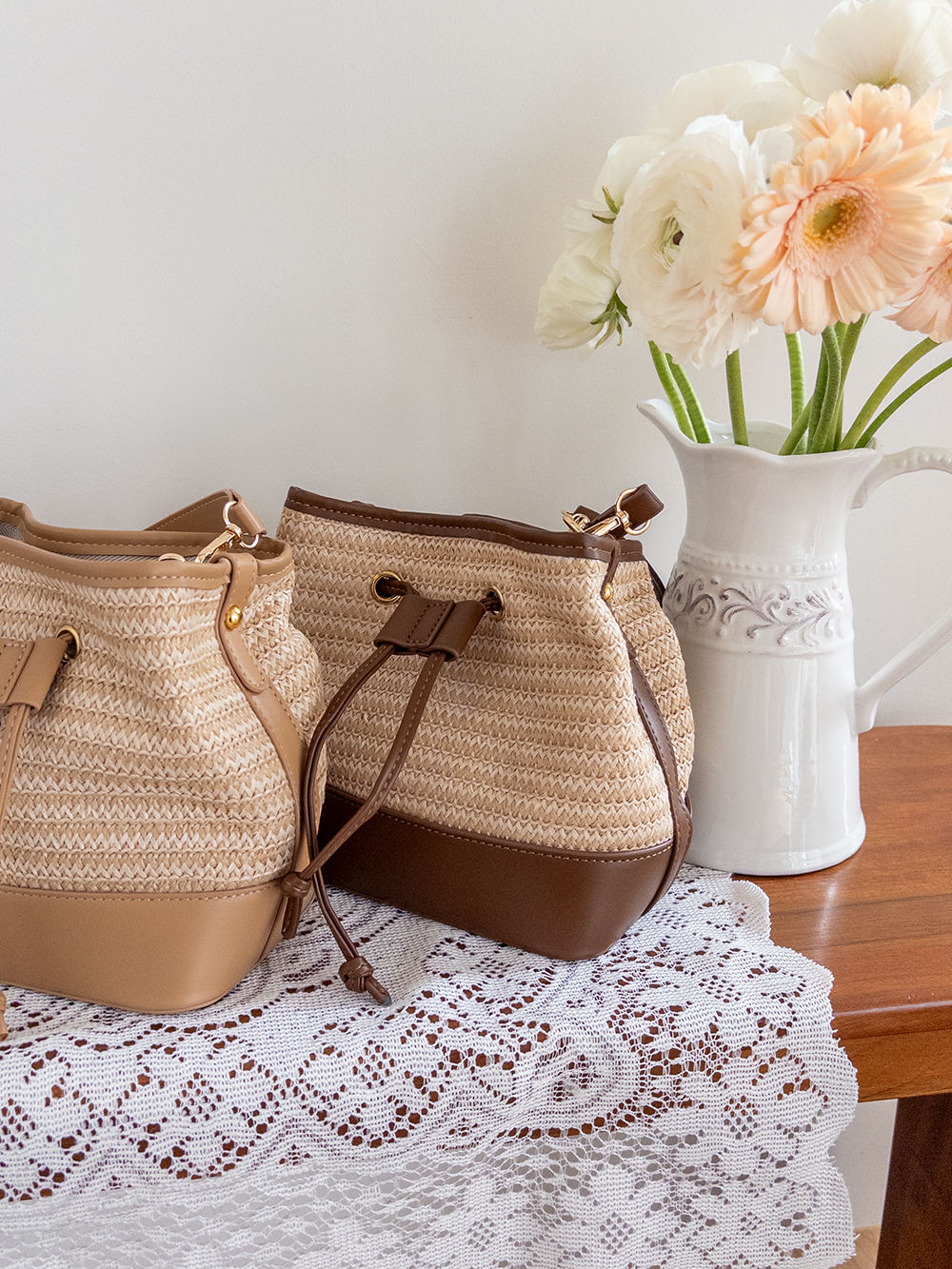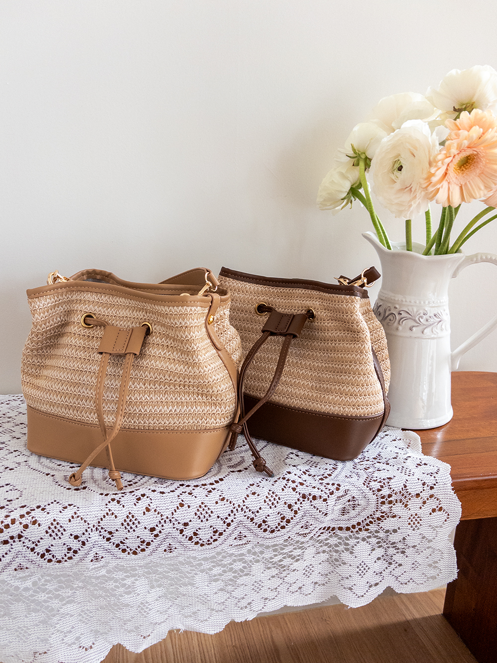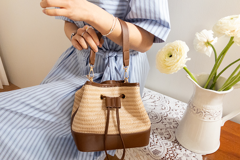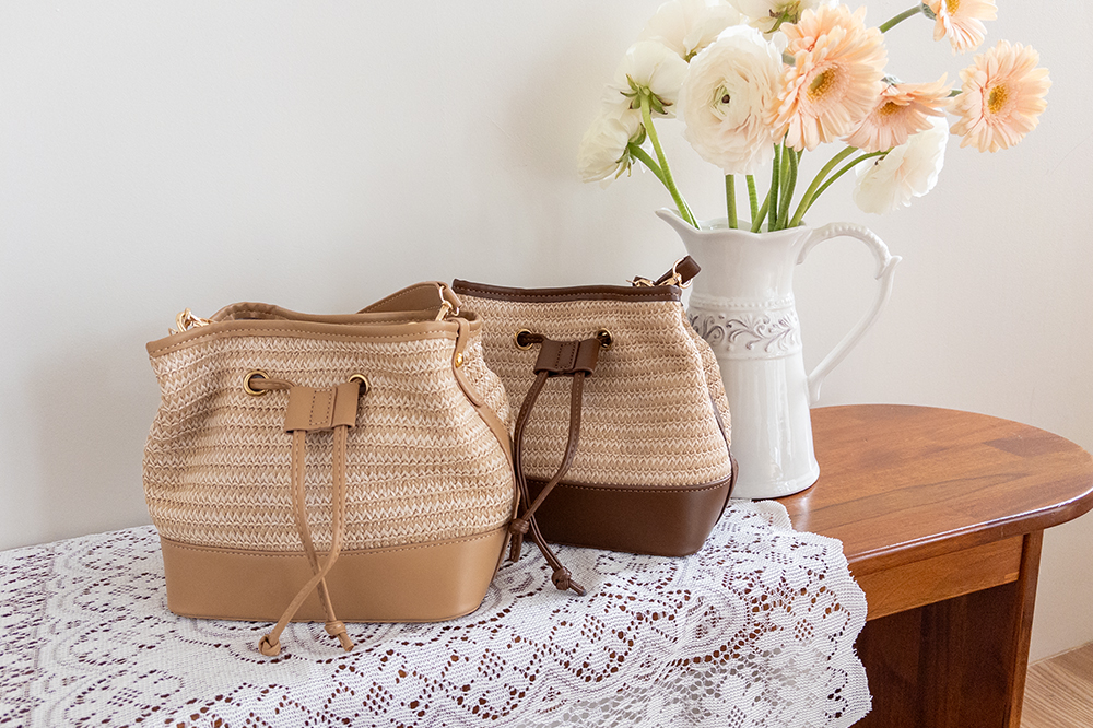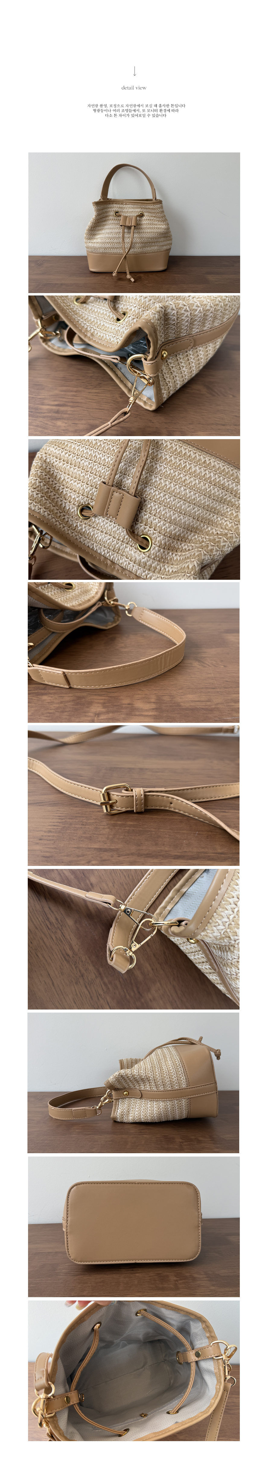 가볍게 들기 좋은 라탄 복조리 백 소개드려요 ^^ 내추럴한 짜임의 라탄 소재로 시원하고 가벼운 분위기를 연출해주며 여름 시즌에 잘 어울리는 아이템이에요. 윗부분은 복조리 스트링 디테일로 조여서 연출하면 자연스럽게 셔링이 잡혀 입체감 있는 쉐입이 만들어지고요, 바닥과 스트링 부분에는 레더 느낌의 배색 디테일을 더해 내추럴함 속에서도 안정감 있고 완성도 높은 디자인을 보여줍니다. 끈은 긴 스트랩과 짧은 스트랩이 함께 구성되어 크로스, 숄더, 토트까지 다양한 스타일로 활용 가능해요. 데일리룩부터 휴양지룩까지 포인트 주기 좋은 백으로 추천드릴게요 ♥