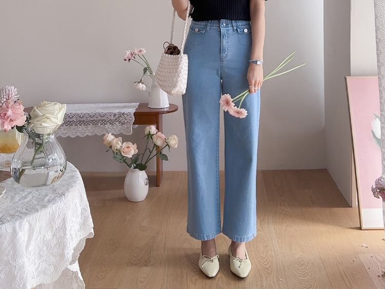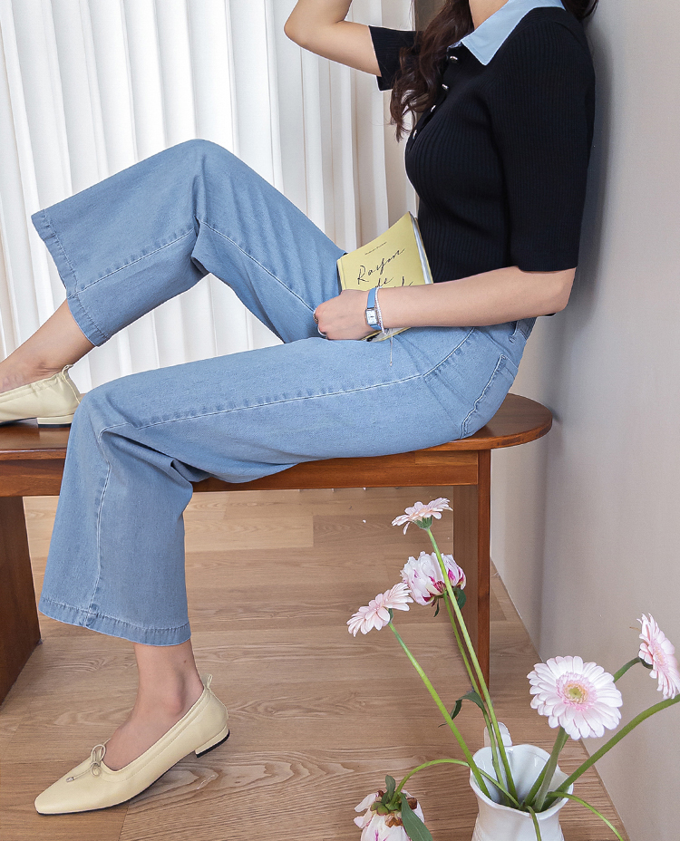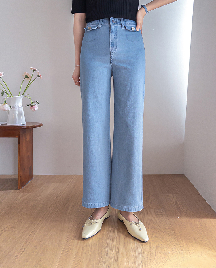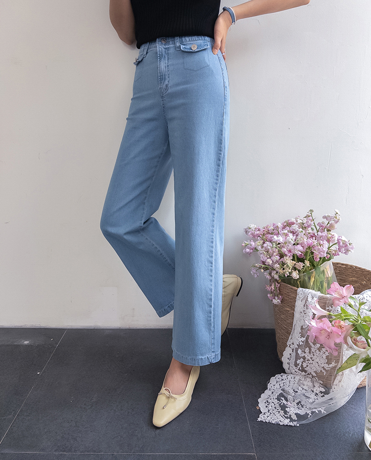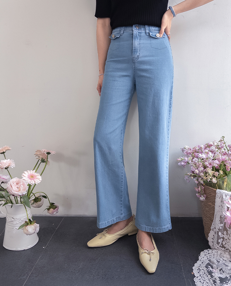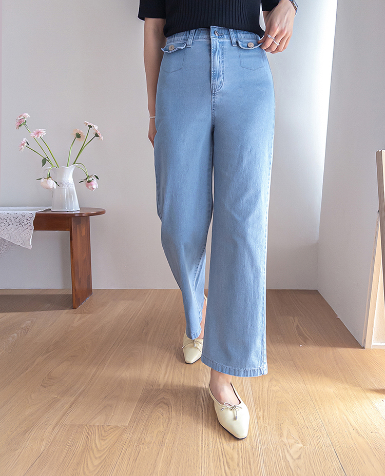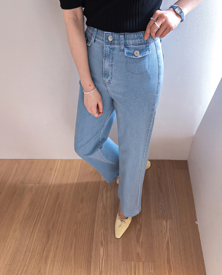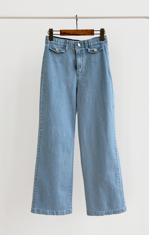 보기만 해도 시원한 느낌이 드는 연청 데님 팬츠 소개드려요 :) 전체적으로 맑고 부드러운 연청 컬러감으로 무겁지 않고 산뜻한 분위기를 연출해주며, 봄부터 여름까지 가볍게 입기 좋은 아이템이에요. 원단은 얇고 유연한 데님 소재에 스판이 더해져 입었을 때 뻣뻣함 없이 부드럽게 감기고 활동할 때도 정말 편안하게 착용되는 팬츠예요. 핏은 허리와 힙은 안정감 있게 잡아주면서 밑단까지 곧고 여유 있게 떨어지는 세미와이드 라인으로 다리 라인을 길고 반듯해 보이게 연출해주고요, 과하게 벙벙하지 않아 데일리로 부담 없이 입기 좋아요. 가장 큰 포인트는 앞쪽의 덮개형 포켓 디테일이에요. 작은 플랩에 버튼을 더한 디자인으로 기본 데님보다 훨씬 더 경쾌하고 감각적인 분위기를 살려주며 상의를 넣어 입었을 때 디테일이 더욱 돋보여요. 티셔츠, 니트, 블라우스 어디에나 잘 어울려 편안하면서도 포인트 있게 입기 좋은 데일리 데님으로 추천드릴게요 ♥