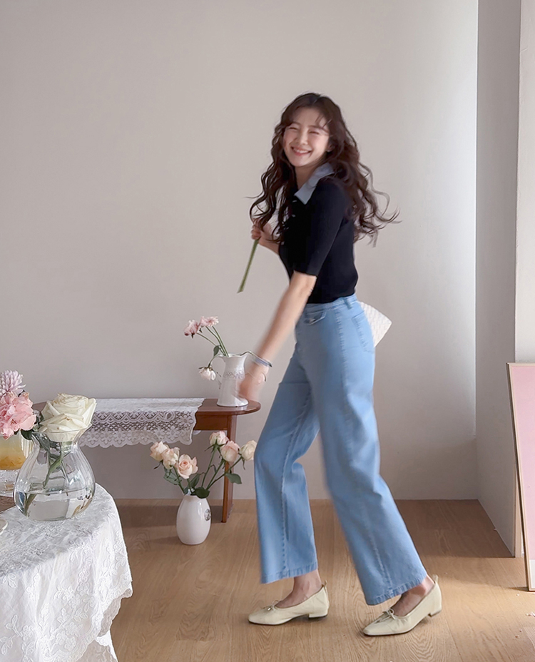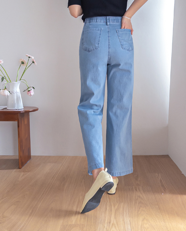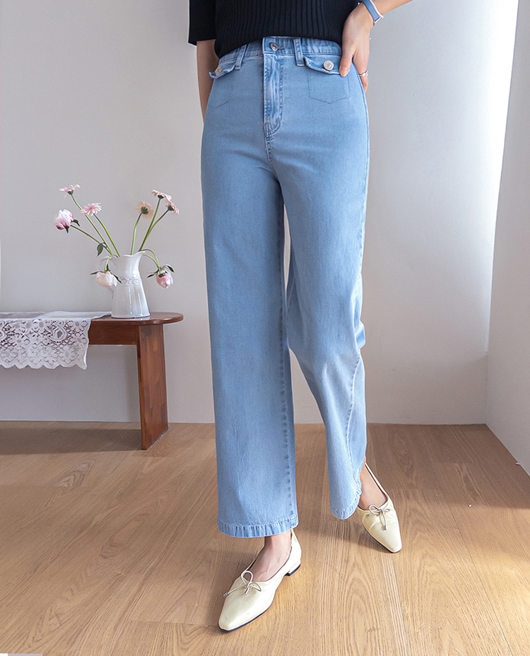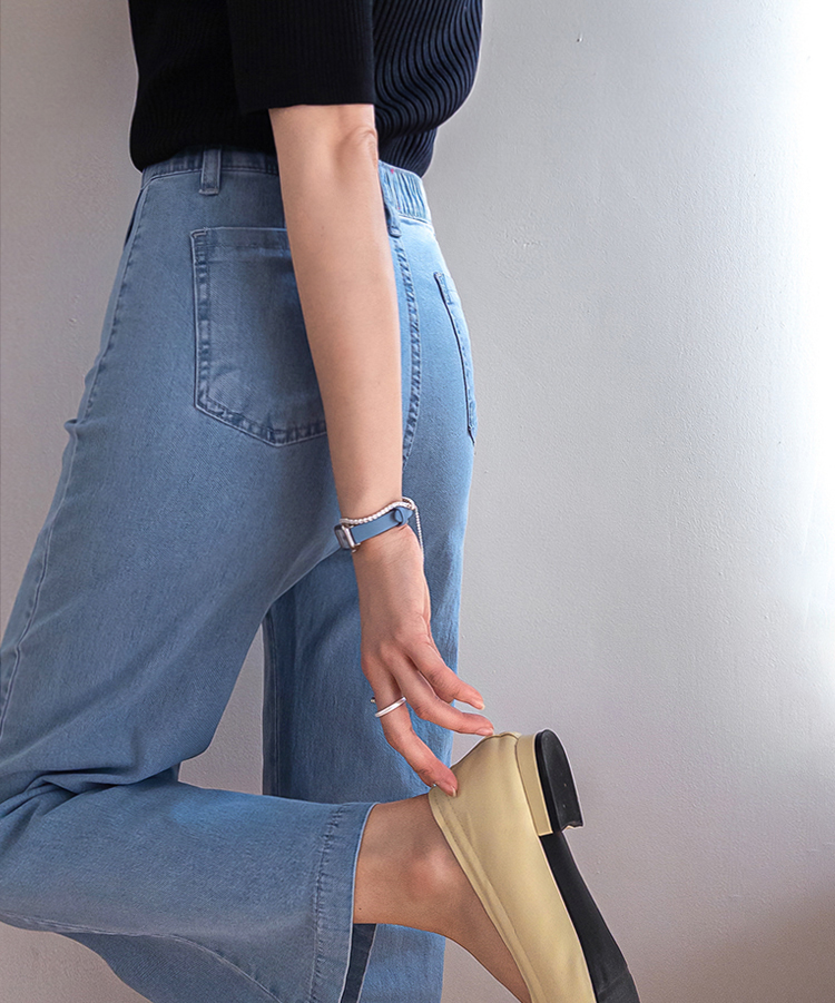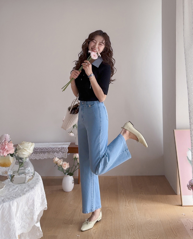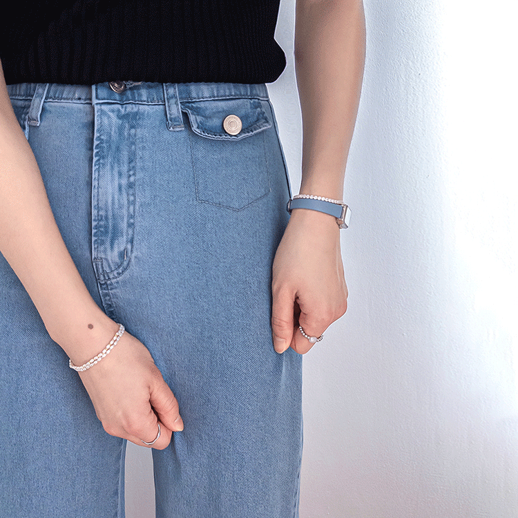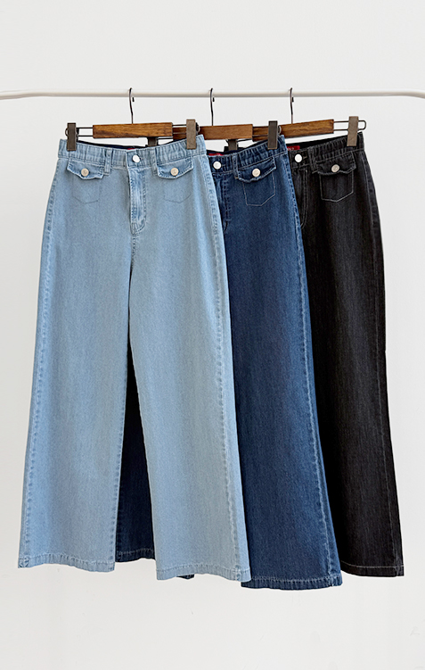 보기만 해도 시원한 느낌이 드는 연청 데님 팬츠 소개드려요 :) 전체적으로 맑고 부드러운 연청 컬러감으로 무겁지 않고 산뜻한 분위기를 연출해주며, 봄부터 여름까지 가볍게 입기 좋은 아이템이에요. 원단은 얇고 유연한 데님 소재에 스판이 더해져 입었을 때 뻣뻣함 없이 부드럽게 감기고 활동할 때도 정말 편안하게 착용되는 팬츠예요. 핏은 허리와 힙은 안정감 있게 잡아주면서 밑단까지 곧고 여유 있게 떨어지는 세미와이드 라인으로 다리 라인을 길고 반듯해 보이게 연출해주고요, 과하게 벙벙하지 않아 데일리로 부담 없이 입기 좋아요. 가장 큰 포인트는 앞쪽의 덮개형 포켓 디테일이에요. 작은 플랩에 버튼을 더한 디자인으로 기본 데님보다 훨씬 더 경쾌하고 감각적인 분위기를 살려주며 상의를 넣어 입었을 때 디테일이 더욱 돋보여요. 티셔츠, 니트, 블라우스 어디에나 잘 어울려 편안하면서도 포인트 있게 입기 좋은 데일리 데님으로 추천드릴게요 ♥