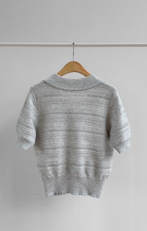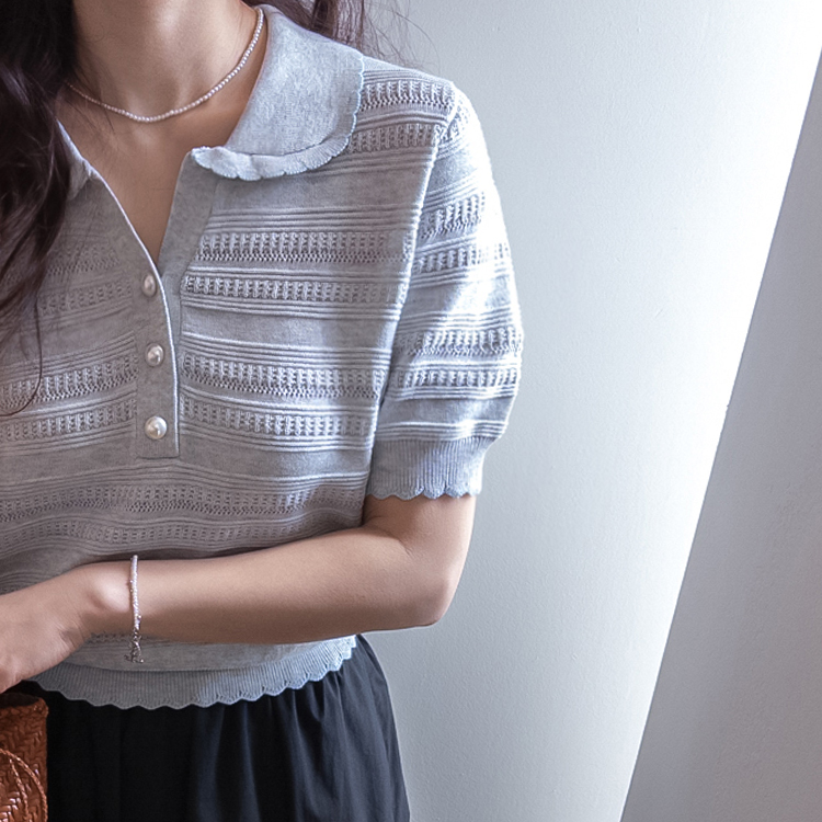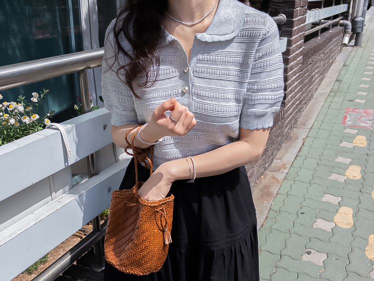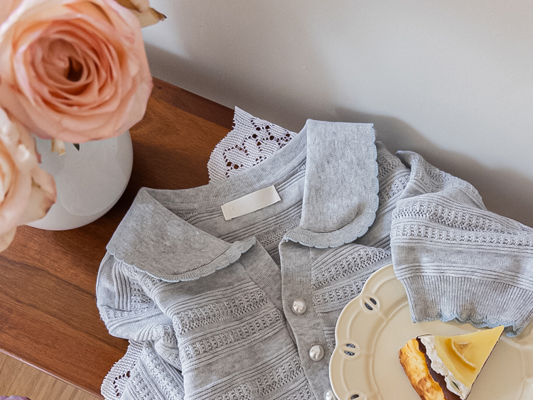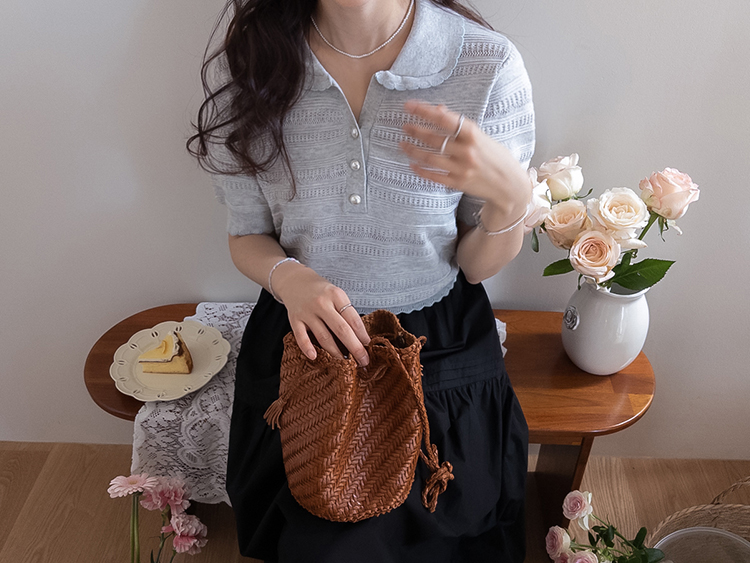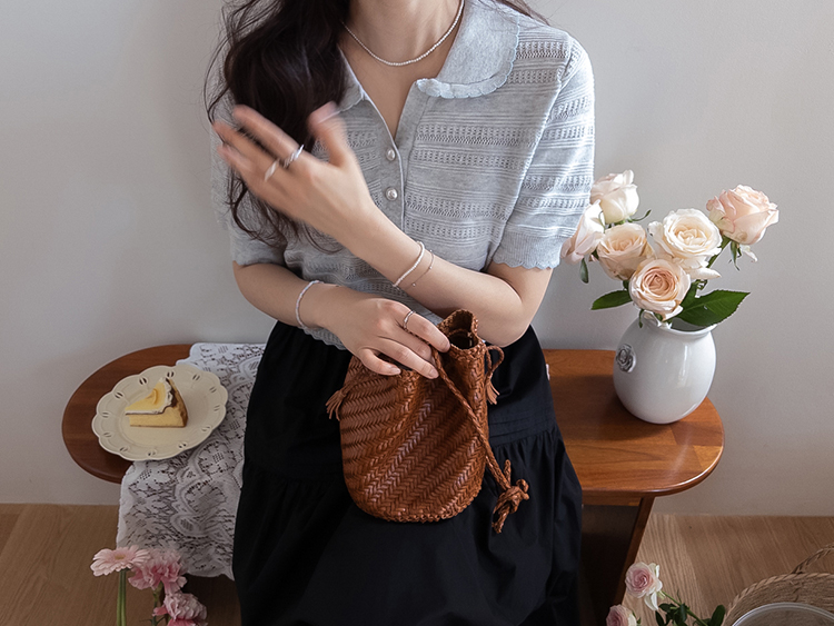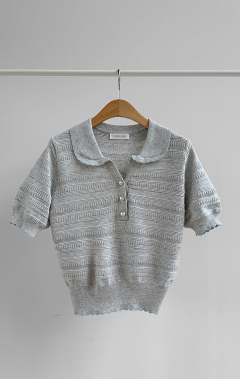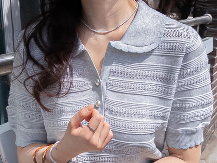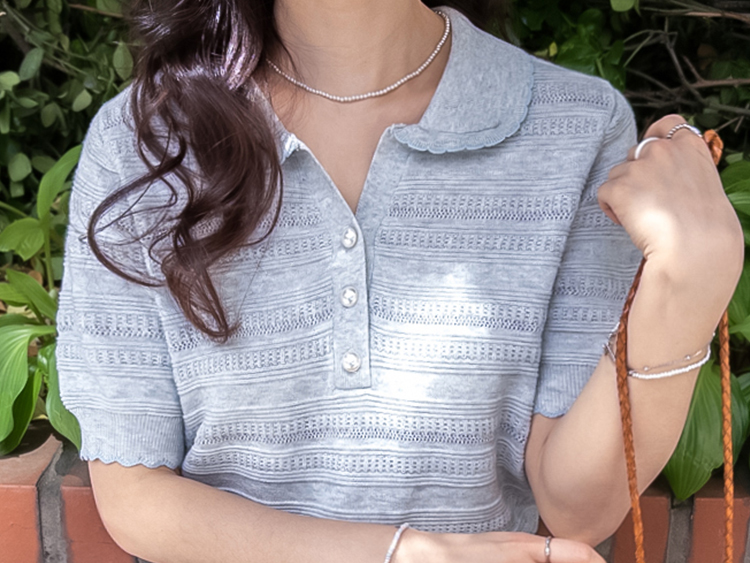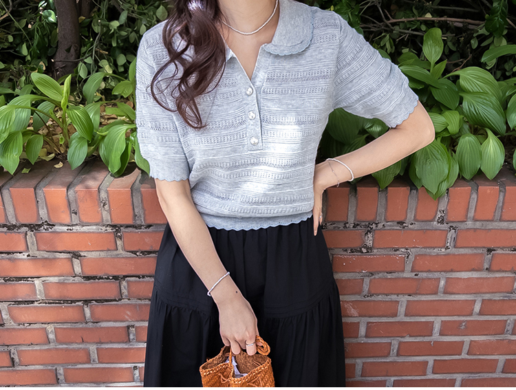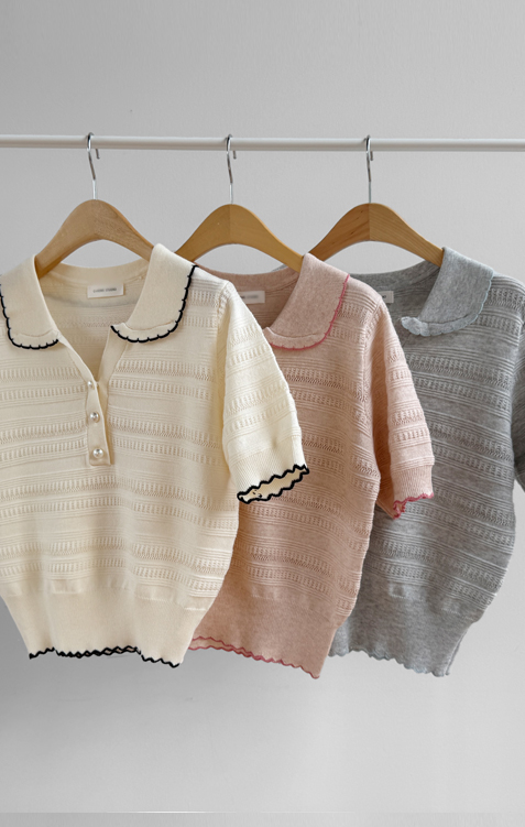 사랑스럽고 단정한 분위기가 동시에 느껴지는 카라 니트 소개드려요 :) 전체적으로 잔잔한 조직감이 느껴지는 니트에 물결 디테일 카라가 더해져 은은하면서도 포인트가 되는 아이템이에요*.* 물결 마감 디테일에 은은한 배색이 더해져 얼굴을 더욱 부드럽고 화사하게 연출해주구요~ 프론트에는 진주 버튼이 더해져 고급스러우면서도 여성스러운 무드를 한층 더 살려준답니다✨ 바디에 적당히 핏되는 예쁜 실루엣으로 부해 보임 없이 라인을 자연스럽게 잡아주어 더욱 여리해 보여요 :) 부드럽고 신축성 좋은 니트 소재로 착용감이 편안하면서도 가볍게 데일리로 즐기기 좋구요! 단독으로 입어도 충분히 포인트가 되며, 가디건이나 자켓 안에 이너로 매치해도 카라 디테일이 살아나 더욱 예쁘게 연출돼요 :) 데님, 스커트, 슬랙스 어디에나 잘 어울려 데일리룩부터 데이트룩까지 다양하게 활용 가능한 니트로 추천드릴게요♡