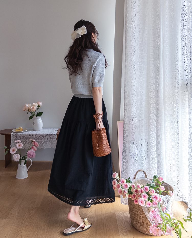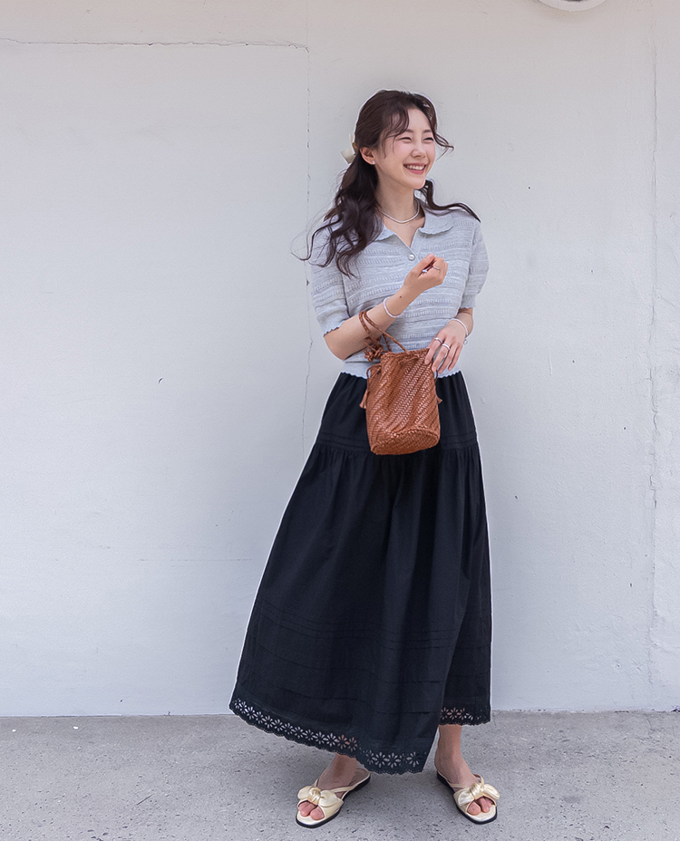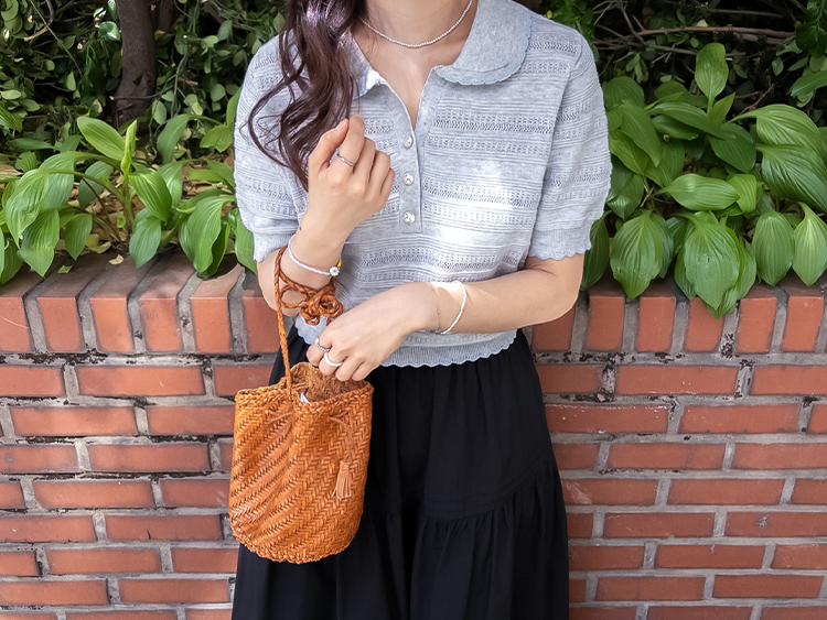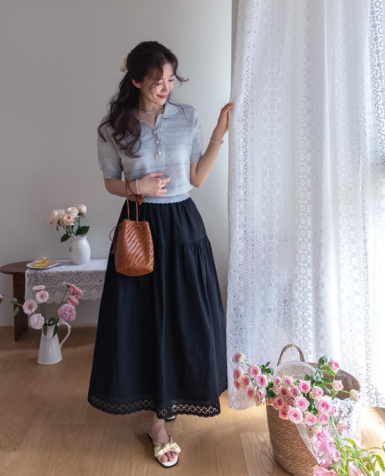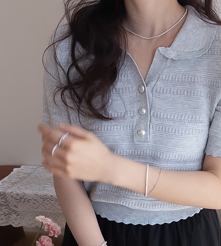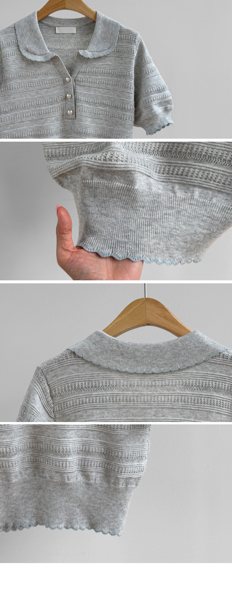 사랑스럽고 단정한 분위기가 동시에 느껴지는 카라 니트 소개드려요 :) 전체적으로 잔잔한 조직감이 느껴지는 니트에 물결 디테일 카라가 더해져 은은하면서도 포인트가 되는 아이템이에요*.* 물결 마감 디테일에 은은한 배색이 더해져 얼굴을 더욱 부드럽고 화사하게 연출해주구요~ 프론트에는 진주 버튼이 더해져 고급스러우면서도 여성스러운 무드를 한층 더 살려준답니다✨ 바디에 적당히 핏되는 예쁜 실루엣으로 부해 보임 없이 라인을 자연스럽게 잡아주어 더욱 여리해 보여요 :) 부드럽고 신축성 좋은 니트 소재로 착용감이 편안하면서도 가볍게 데일리로 즐기기 좋구요! 단독으로 입어도 충분히 포인트가 되며, 가디건이나 자켓 안에 이너로 매치해도 카라 디테일이 살아나 더욱 예쁘게 연출돼요 :) 데님, 스커트, 슬랙스 어디에나 잘 어울려 데일리룩부터 데이트룩까지 다양하게 활용 가능한 니트로 추천드릴게요♡